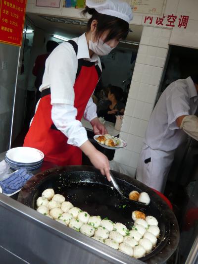 上海名物の「生煎」は大きな鉄板で蒸焼きにされます