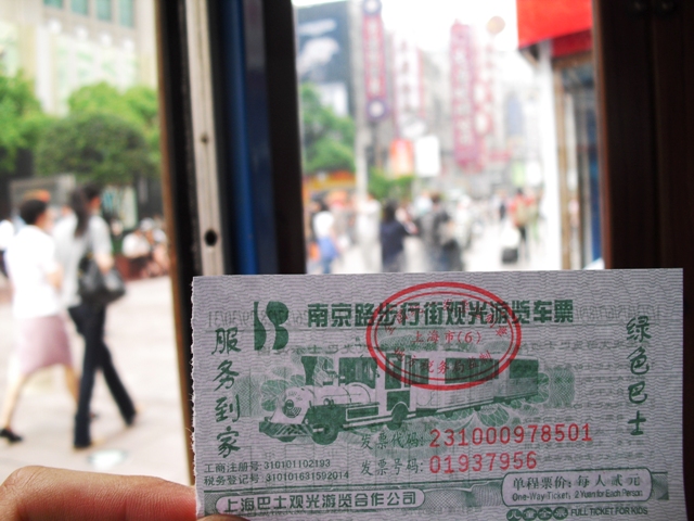 歩行者天国の両端にある石碑から50mくらい内に入ったところがバス停ですが列などはなく、バスが来て客が降りたところに早い者勝ちでまず座ります。全員降りるとは限りません。往復の人もいますから。席が取れたら出発前にまわってくる徴収係りに2元渡します。出発したら途中下車はできません。道路の込み具合によりますが片道10分弱です。