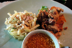 パッタイとソフトシェルクラブのフライ・ソンタムのプレートを頼みましたが、どちらもタイ料理という感じがしない。あまりに外国人向けにアレンジしすぎているようです。別の皿に添えられているチリソースでなんとなくタイ料理っぽくなってくるぐらい。(←タイ人も辛味を足したりしますが、料理に全く辛味無しで別皿というところがそもそも外国人向けなんですが)