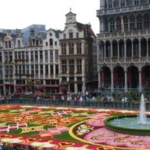 2年に1度開催されているフラワーカーペットを見る為にブリュッセルを訪れました。フラワーカーペットは、グランパレスの中央に作られていて、朝から晩まで多くの人が訪れます!グランプラスは、市庁舎を中心にギルドハウスに囲まれ、壁に飾られた包丁や樽、手押し車などの紋章がそれぞれの職業をあらわしていて、これらの建物にはそれぞれ名前が付けられています。それらの名称は、星、白鳥、黄金の家、鳩、孔雀などですが、名前と照らし合わせながら、ぐるりと取り囲むギルドハウスを見るのも楽しい!さすが世界遺産だけあって、 広場はいつもきれいに整備されています。広場に面して、花々のきれいに飾りつけられたオープンカフェなどもあり大人気でした。おいしいスイーツや、ベルギービールを飲みながらの一休みは最高でしょうね♪ 残念ながら、あまりにオンシーズンだった為混み混みで、今回はカフェへは入れませんでした...。