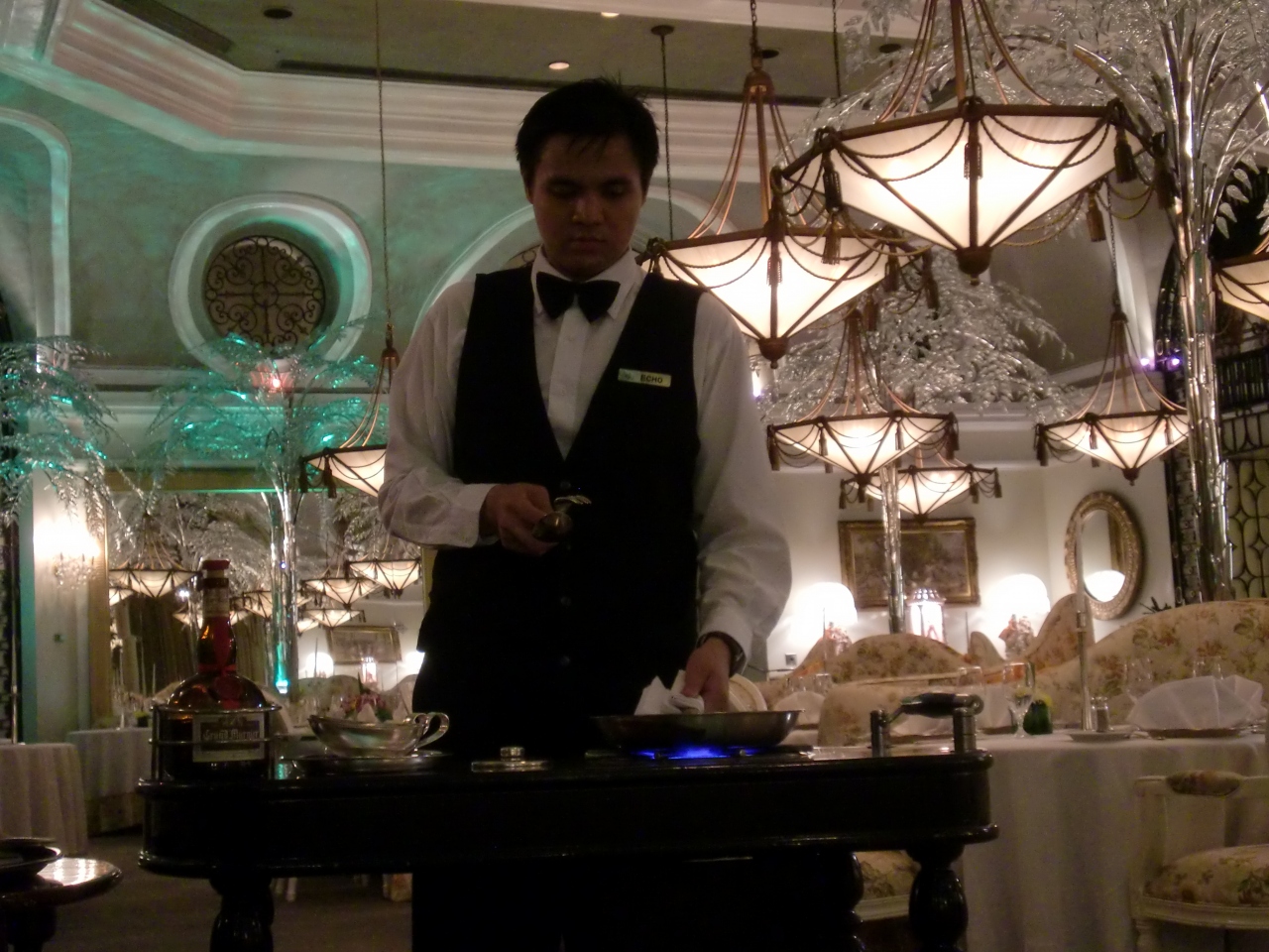 シェフのお勧めコースが1500ペソ(3000円)、グラスワインが320ペソ。デザートのクレープ、目の前でフランベしてくれて400ペソ。ホテルのダイニングで生ピアノも入ってフィリピン物価が安いとはいえ、とてもお値打ちでした。ホテルに泊っていれば、食べたら部屋に帰って寝るだけ極楽。