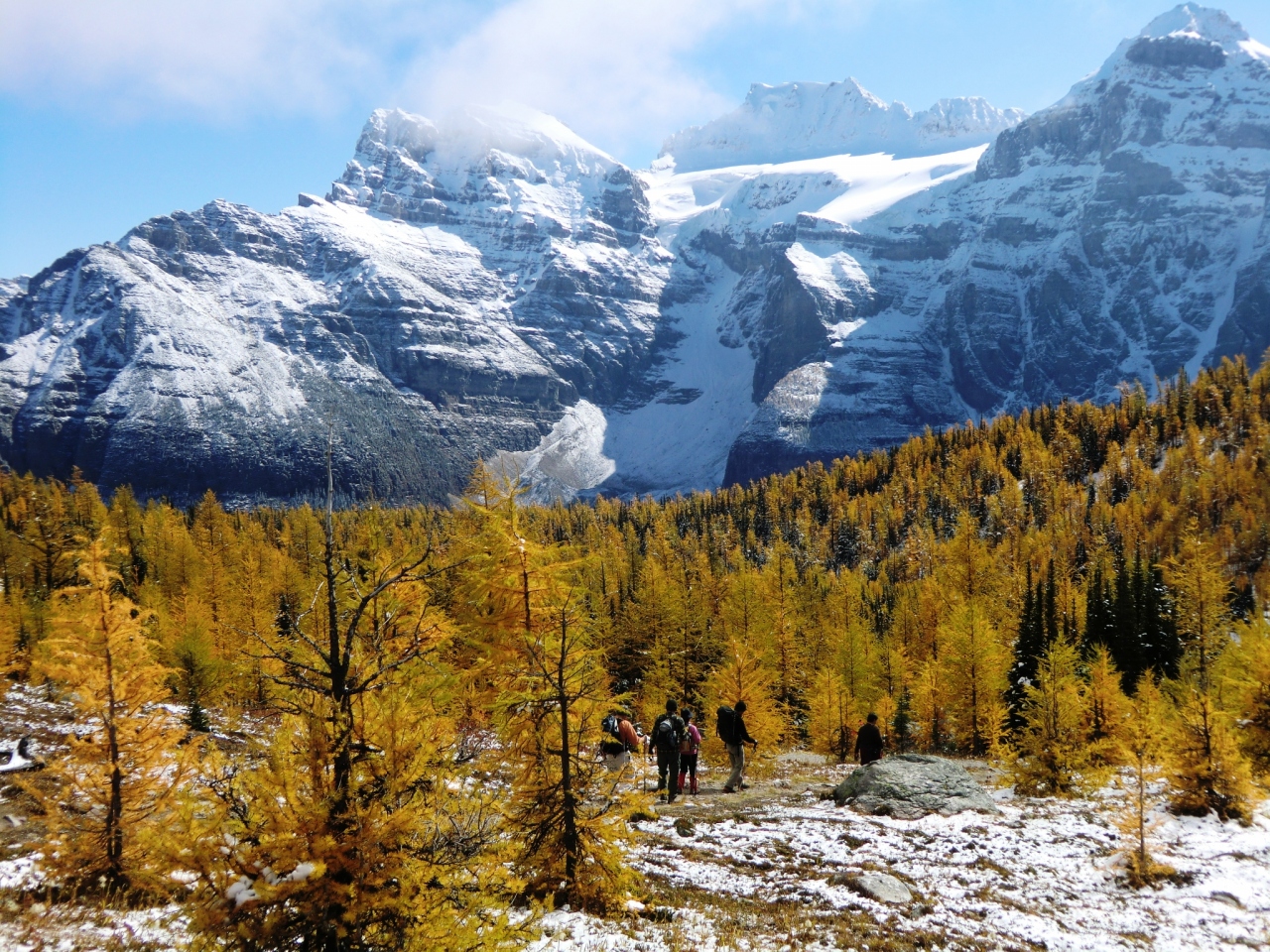 青空と白い雪山と黄葉のラーチの中を歩くのは最高!