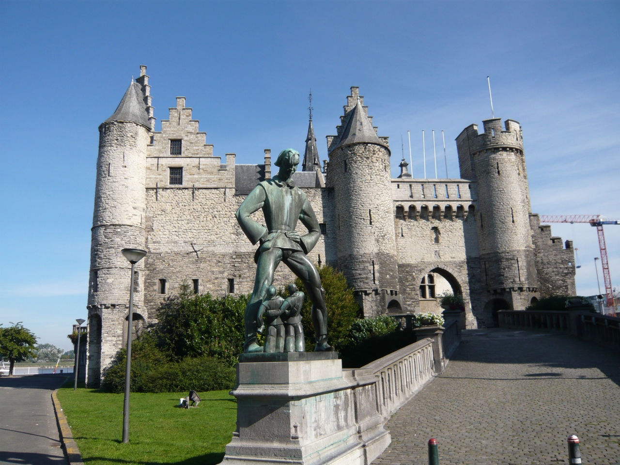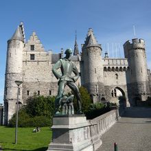 スヘルデ河畔にあるこのステーン城(海洋博物館)入り口には、アントワープの地名の由来になった大男の銅像があります。銅像といっても、とっても漫画チックで、笑えます。
