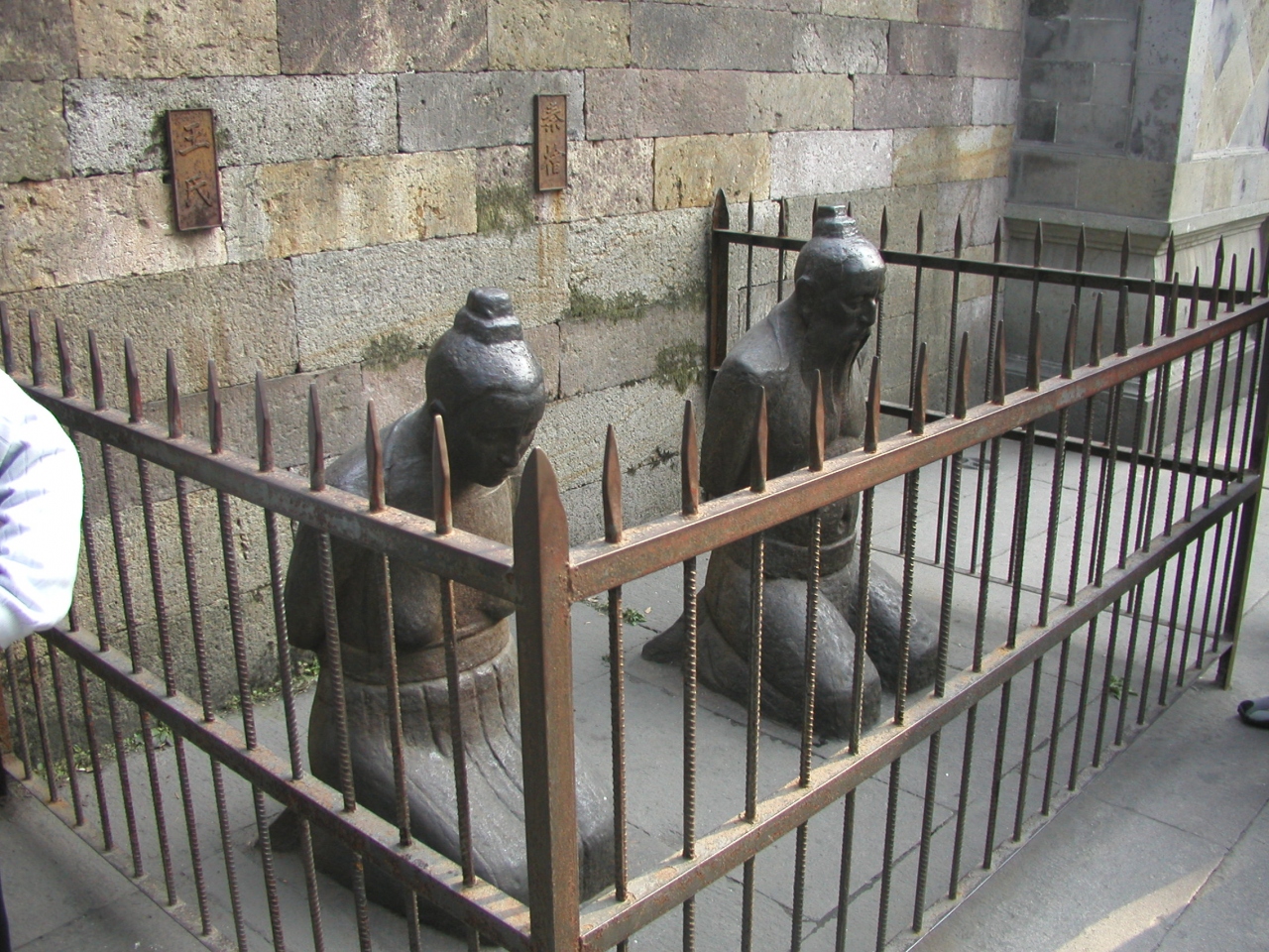 写真の像に中国人はつばをかけます。英雄である岳飛を裏切った者への仕打ちとして。