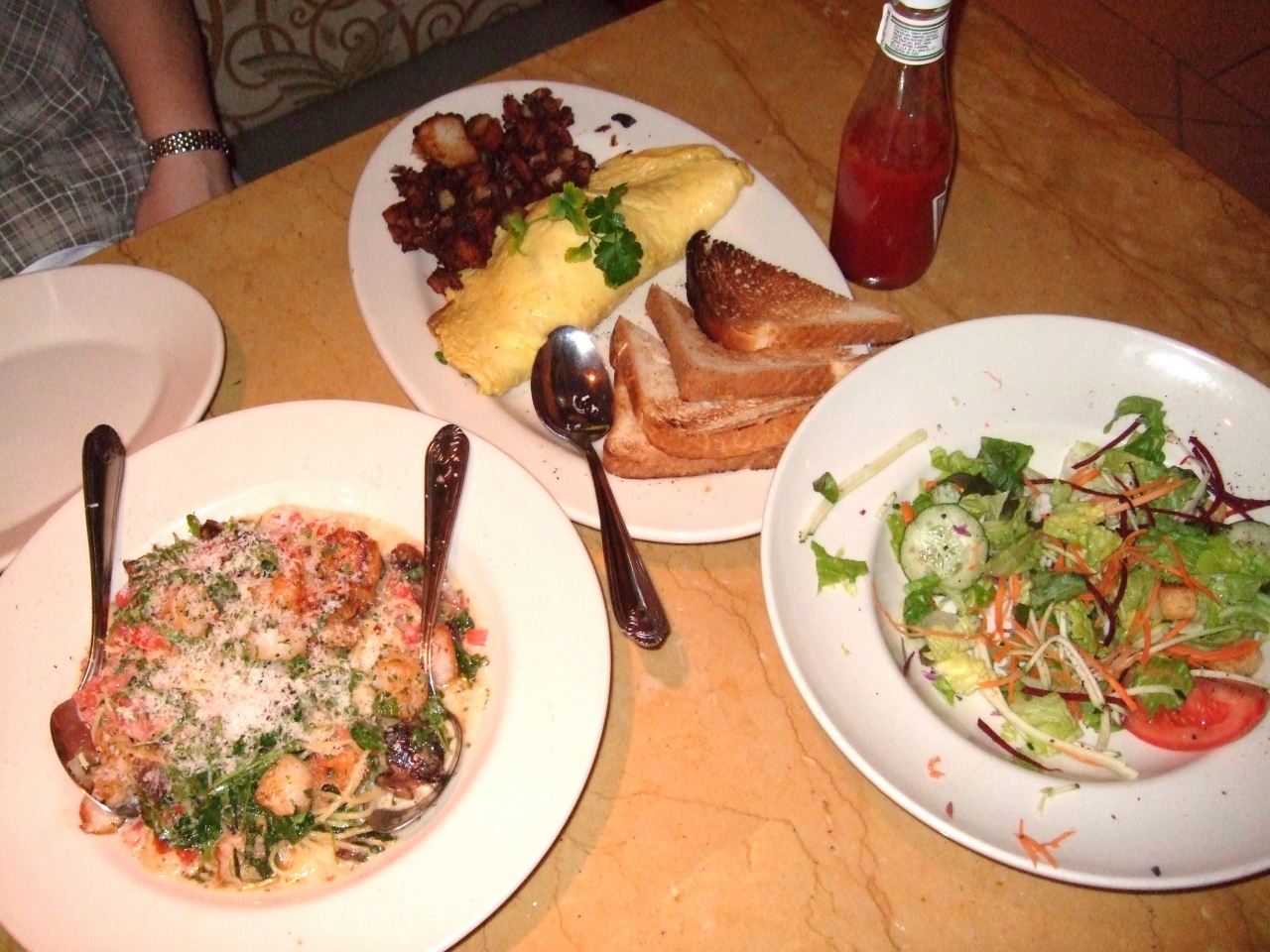 しかし時間になるとブザーがなるカードを渡されますのでその近辺で買い物してれば、あっという間です。料理はどれもものすごい量なのでほんとに頼みすぎには注意です。メニューは日本語ですが料理の名前だけで写真がないので聞きなれないメニューをオーダーすると予想外な料理だったりします・・・。味は大味で値段の割には普通です。パスタを注文する方はアルデンテででてくる事はありません。(給食でいうソフト面に近いかも・・・)ここではランチでお得にセットをたのむか、チーズケーキを食るかをオススメします!(でもいつもお腹いっぱいになってしまいますのでその場合はお持ち帰りして下さい!!)