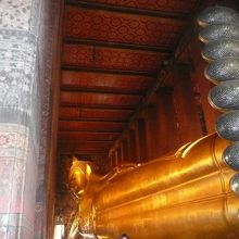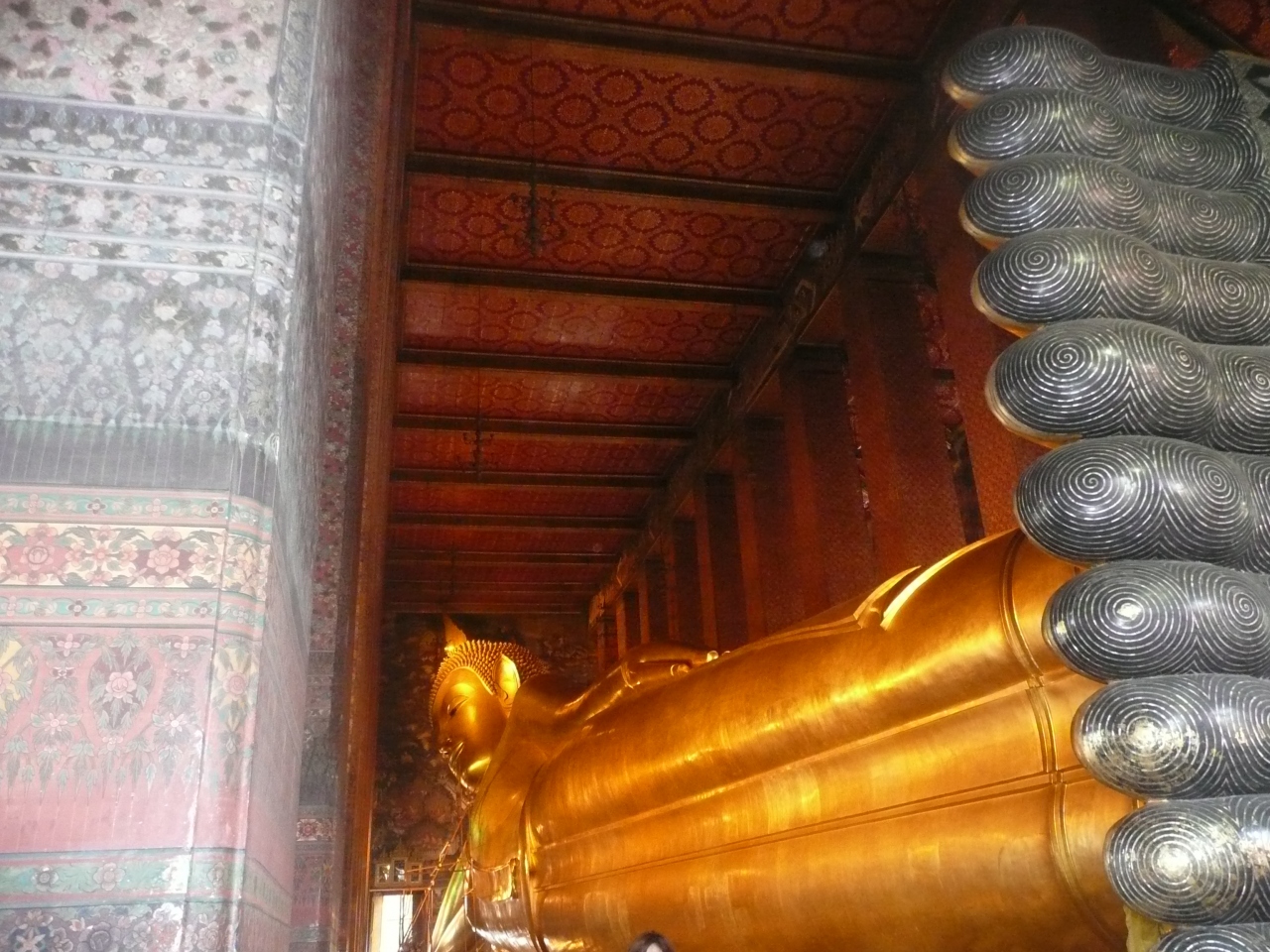 中はいくつかの寺院に分かれていたと思います。それぞれ回ってみても愉しいですが、まずはお目当ての黄金の涅槃陀仏のあるところへ。この大きな涅槃陀仏をぐるーっと回ってみたら、入り口にあるアルミの入れ物に入ったサタン硬貨を購入(寄付なので、だいたい20バーツくらい?)。この硬貨を108つの鉢に入れていきます。ひとつの鉢に硬貨1枚ずつだったか、もう忘れましたが、途中で硬貨が尽きて最後まで入れられなかったり、家族でこれも楽しめました。