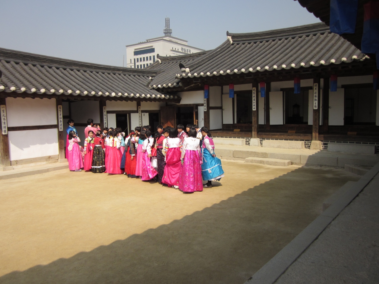初日にセットの観光は南山韓屋村(ナムサンハノクマウル)ここは昔の両班(ヤンパン)貴族の邸宅を数件移築した場所です 有名なお宅は門に向って左隅のお家です 儒教の暮らし方でご主人さま使用のハウスと奥様使用のハウスと別れています どうやって毎夜!コミュニケーションとったのだろう??余分な事を想像しつつ 有る事に気づきました。?。?どの家にも風呂場が無い!!ガイドさんに聞いてみたところ!韓国は寒いのでバスタブには浸からないのですって、お湯で身体を拭くだけだったそうです。「あっそれで!垢するのか。」ちなみにトイレは[おまる]!ギョギョ!