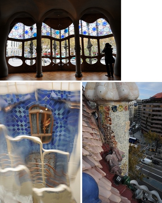 このカサ・バトリョのテーマは海ということで、外壁に無数にはめ込まれた色ガラスは海面の輝きのよう。屋上部分の外壁の形も海面が波打っているかのような印象です。