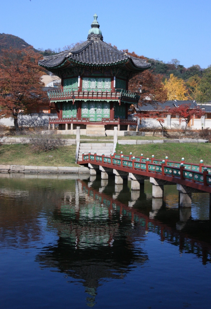 景福宮は1395年に創建した朝鮮王朝第一の法宮(王の住む宮廷)。北に北岳山、正門である光化門の前に広い六曹通り(今の世宗路)が開かれた漢陽(ソウル)の中心だった。