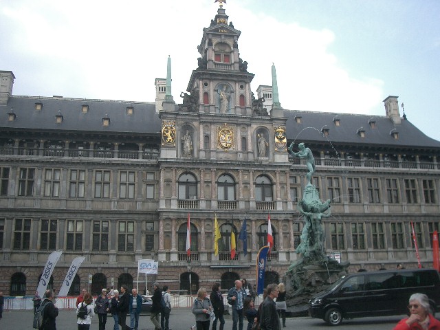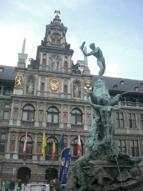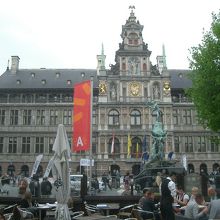 アントワープの市庁舎は1560年代に建てられたルネサンス様式の建物です。正面広場にはブラボーの像のある噴水があります。この像と市庁舎を一緒に写真に撮るひとがたくさんいます。ごたぶんにもれず、当方もそんな写真を撮りました。ブラボーとは、巨人の手を切り取って投げたという伝説の人で、ここからAntwerpen という名前がついてということです。