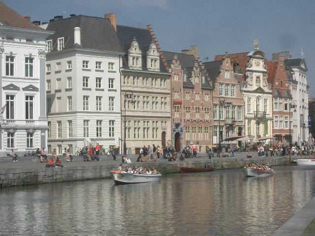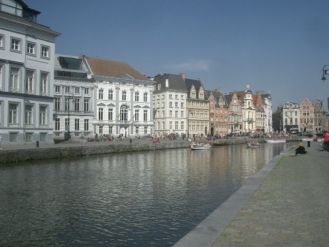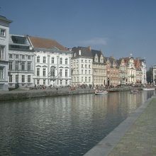 聖ミヒエル橋からみて左側。レイエ川に西岸をコーレンレイという。ギルドハウスがぎっしり並ぶ一帯です。クラシック様式やロマネスク様式の建物が多く、そのファサードの美しさに息をのみます。聖ミヒエル橋からの眺めが良いかな。
