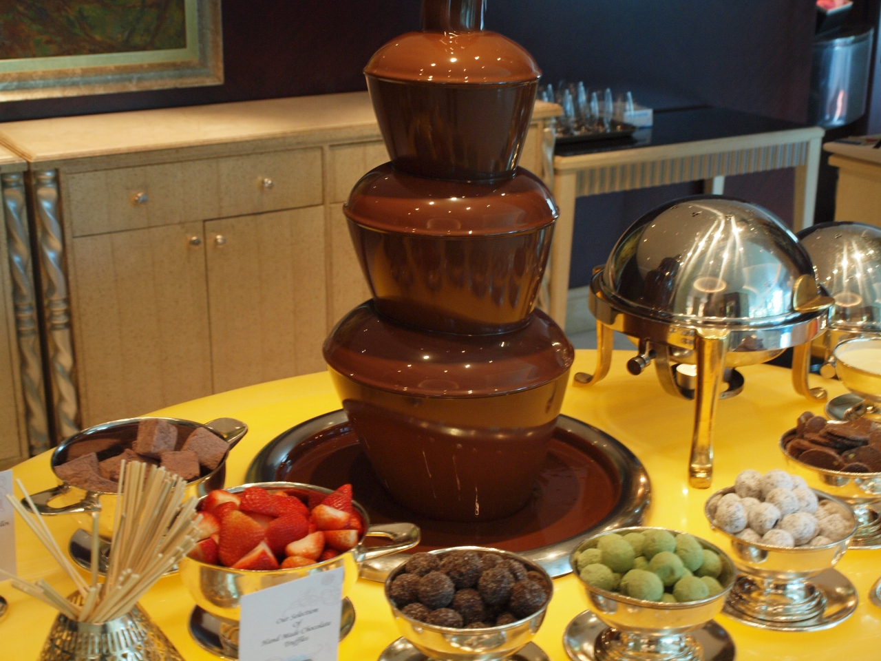 滝のように流れるチョコレートに、イチゴなどをチーズフォンデュみたいに付けていただきます。美味い!