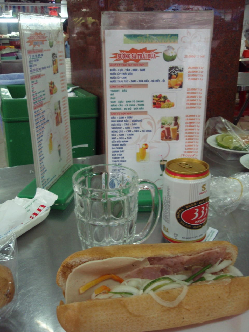 我々は後者を選択してメニューからスタンダードなバインミー2つとビールを注文し、店内の空いた席に腰掛けて眼前にある香辛料・ナンプラーだのを適当にふりかけかぶりつきました。