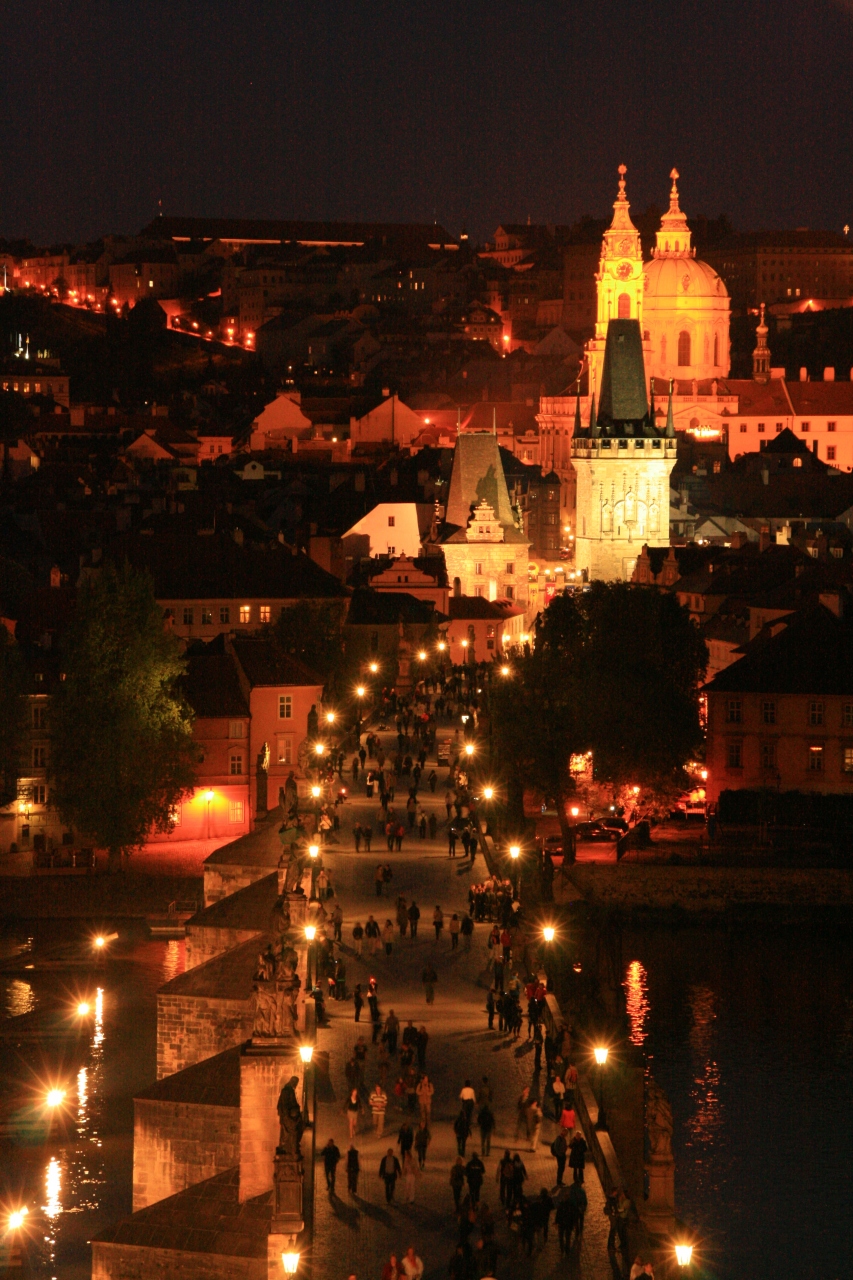 昼間のカレル橋も楽しいのですが、日没から夜にかけてのカレル橋も、ライトアップされてとてもきれいです。人は増える一方で賑やか、大道芸人も昼間より本格化したような!? オススメは、旧市街側の塔から眺めるカレル橋とプラハ城の夜景です。溜息の出るような美しい眺めです。塔は確か22時くらいまで入れます。階段を登って正面にある受付で一人70チェココルナを支払ってレシートを受け取り、最上階を目指します。夜景の写真は5月の21時頃。是非行ってみて下さい。
