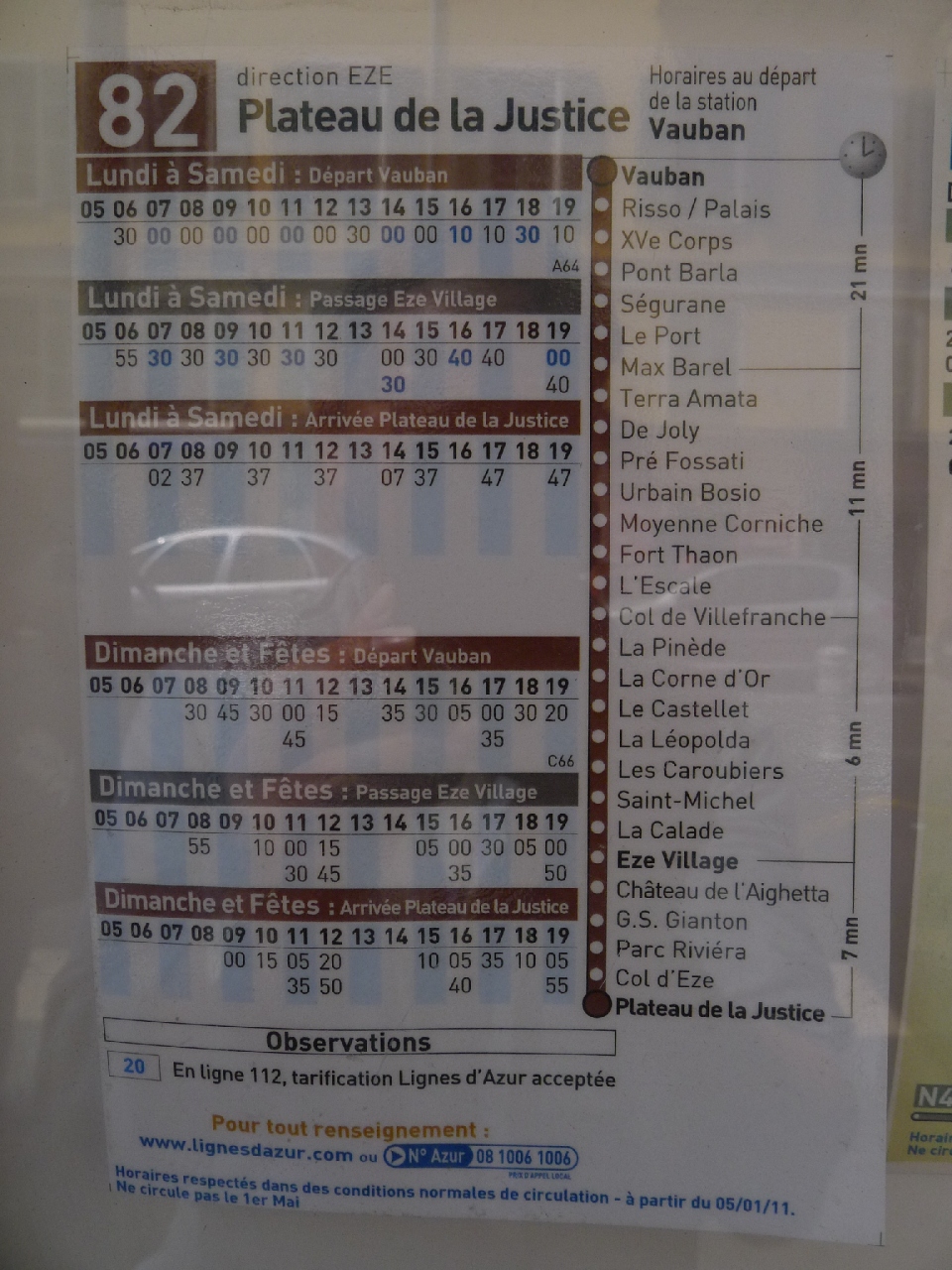 このバス停は、エズを経由する82番とロクブリュヌを経由するマントン行き100番が停まります。