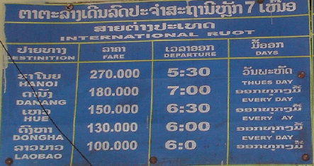 パクセーより北方面行きのバスが発着する、パクセー・北バスターミナルの時刻・運賃表