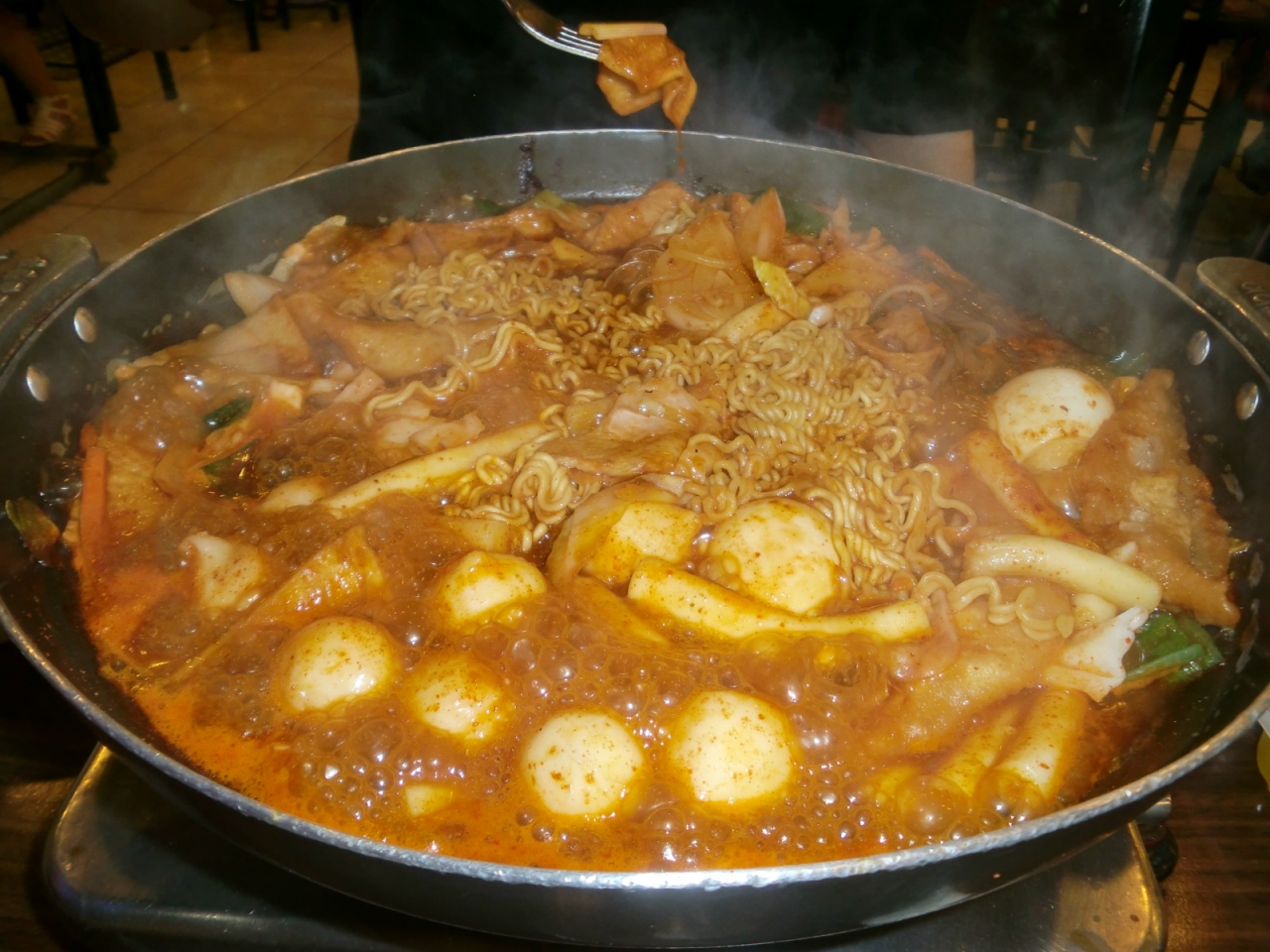 トッポキ鍋は2人前~。ベーシックな新堂トッポキ2人前にチーズトッポキを追加。注文して2分もしないうちに材料の入った鍋がテーブルに運ばれてきました。材料は細めのトッポキ・ラーメン・野菜・ゆで玉子・揚げ餃子・はんぺん。韓国の食堂ではアジュンマが調理してくれる事が多いですが、ここはセルフです。火をつけて、ラーメンを崩しながら煮えるのを待ちます。