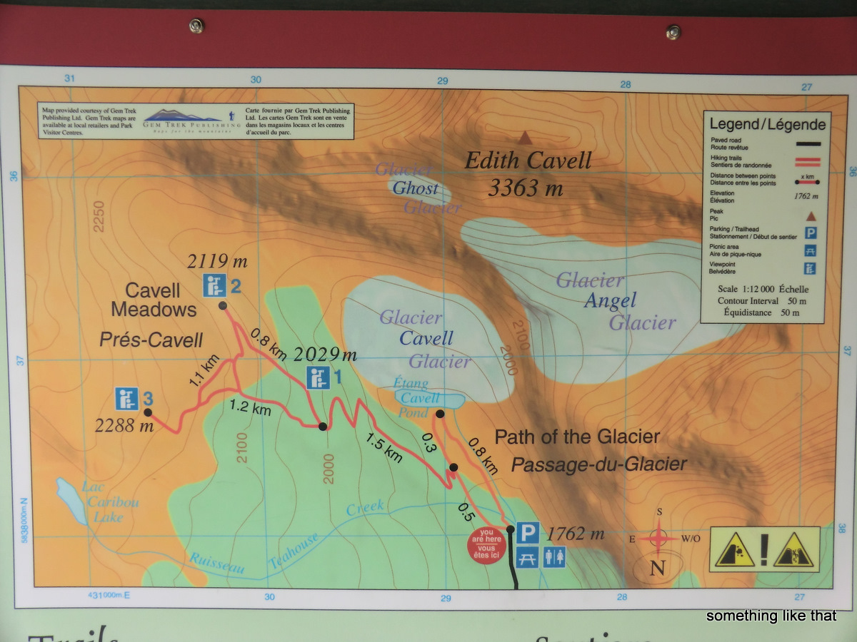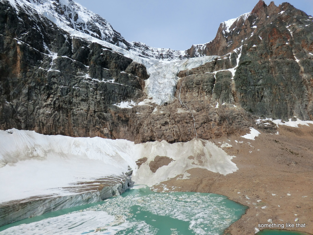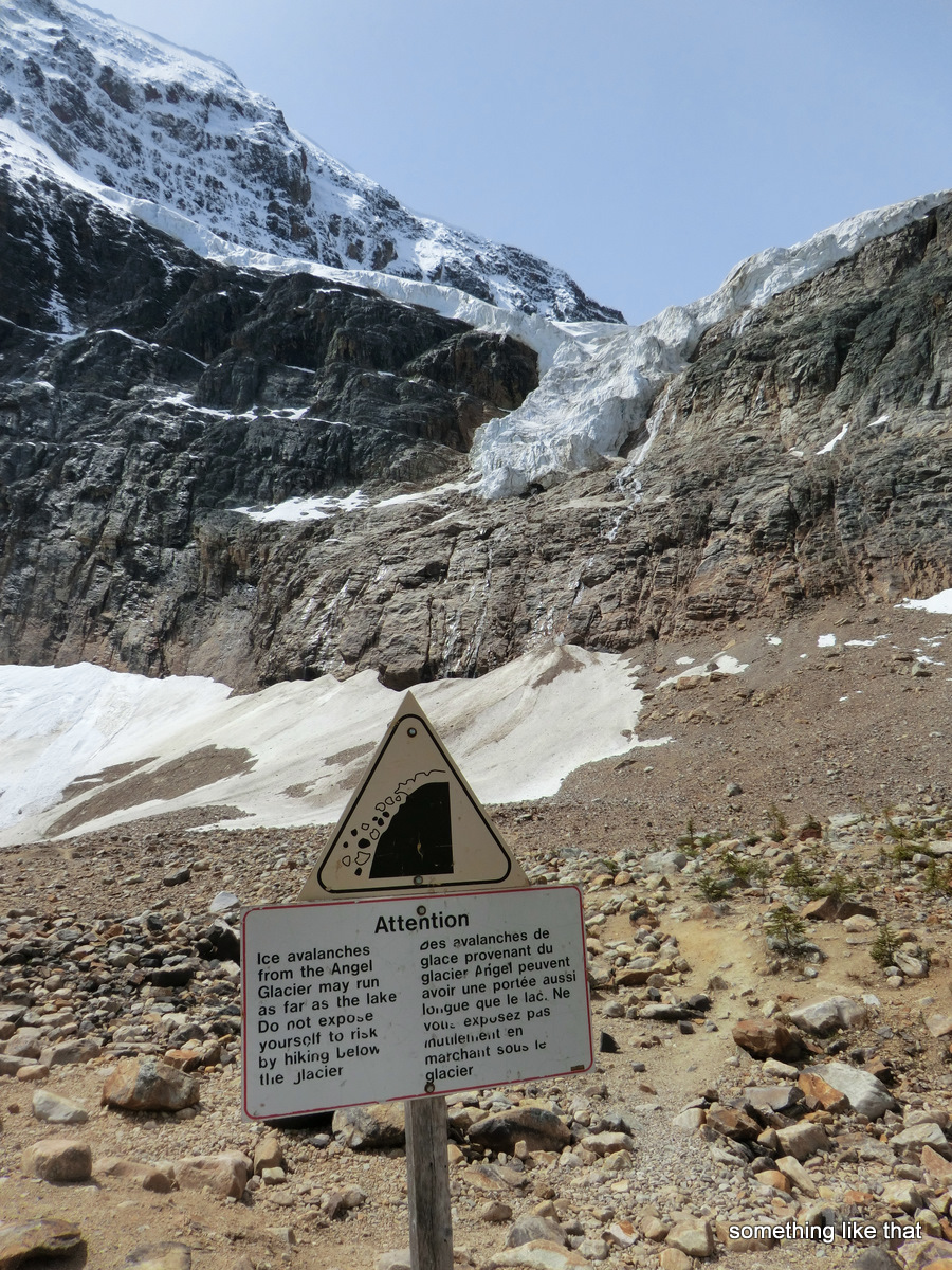 ジャスパーの街から南の方向に見えている雪を被った四角い山が、イデス・キャベル山であり、その麓まで、車でいける。車がないとここへ行くのは少し厳しい。ジャスパーの町から南、アイスフィールドパークウェイを経由して、パークの入り口を越えてすぐのところで右折して山道(舗装道)を走る。駐車場は早く行かないと混雑する。駐車場から、キャベルメドウへ行くトレイルと、氷河の雪溶け水でできた湖やエンジェル氷河のすぐ下へ行く、パス・オブ・ザ・グレイシャーというトレイルがある。行ったときには、キャベルメドウへ行くトレイルはまだ雪が残っており封鎖されていた。ちなみにイデス・キャベルは看護婦の名前、エンジェル氷河はその形が翼を広げたエンジェルのように見えることから。案内板にあった昔の写真を見ると、エンジェル氷河は下の湖まで繋がっていたみたい。