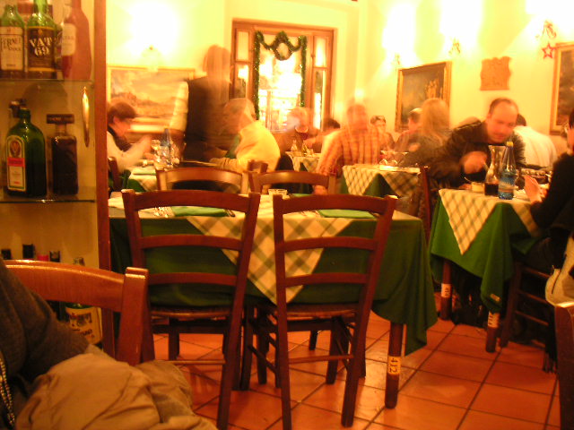 カルボナーラ5ユーロ、ムール貝のソテー(えび付)8ユーロ、牛テールの煮込み12ユーロ、フルーツ+ジェラート3ユーロなど、観光地価格に比べると随分お得だと思います。お店が狭いのとお客が多くてなかなかきてもらえないこともありますが、それだけ評判もいいのかと。トラステヴェレもテルミニからバス、トラムを乗り継げば不便ではありません。