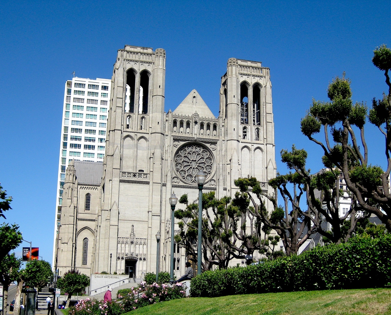 ノブ・ビルの上に建つグレース大聖堂は、1906年の大地震により焼失したが、1928年に現在の荘厳なフレンチゴシック様式の大聖堂に生まれ変わった。