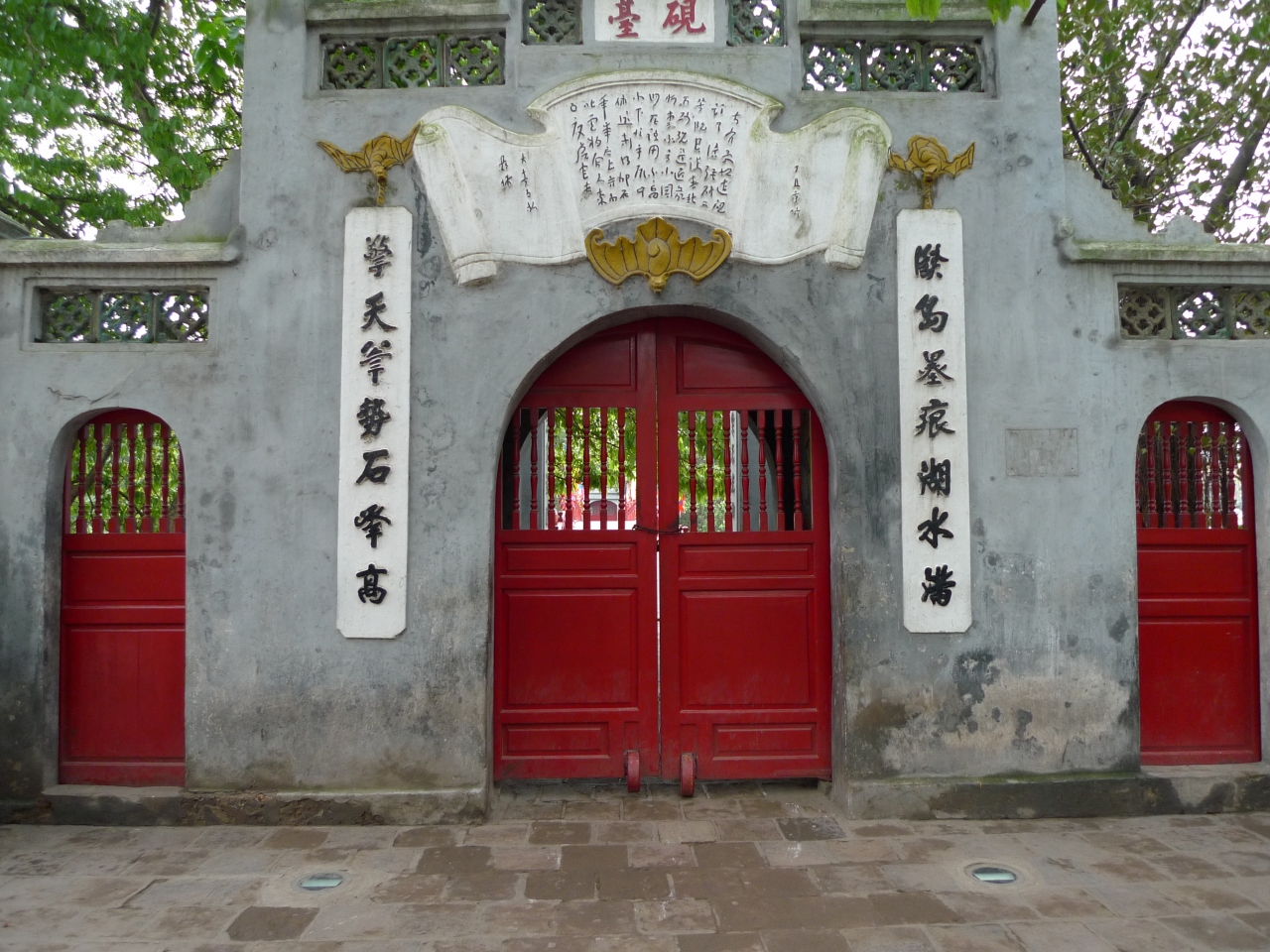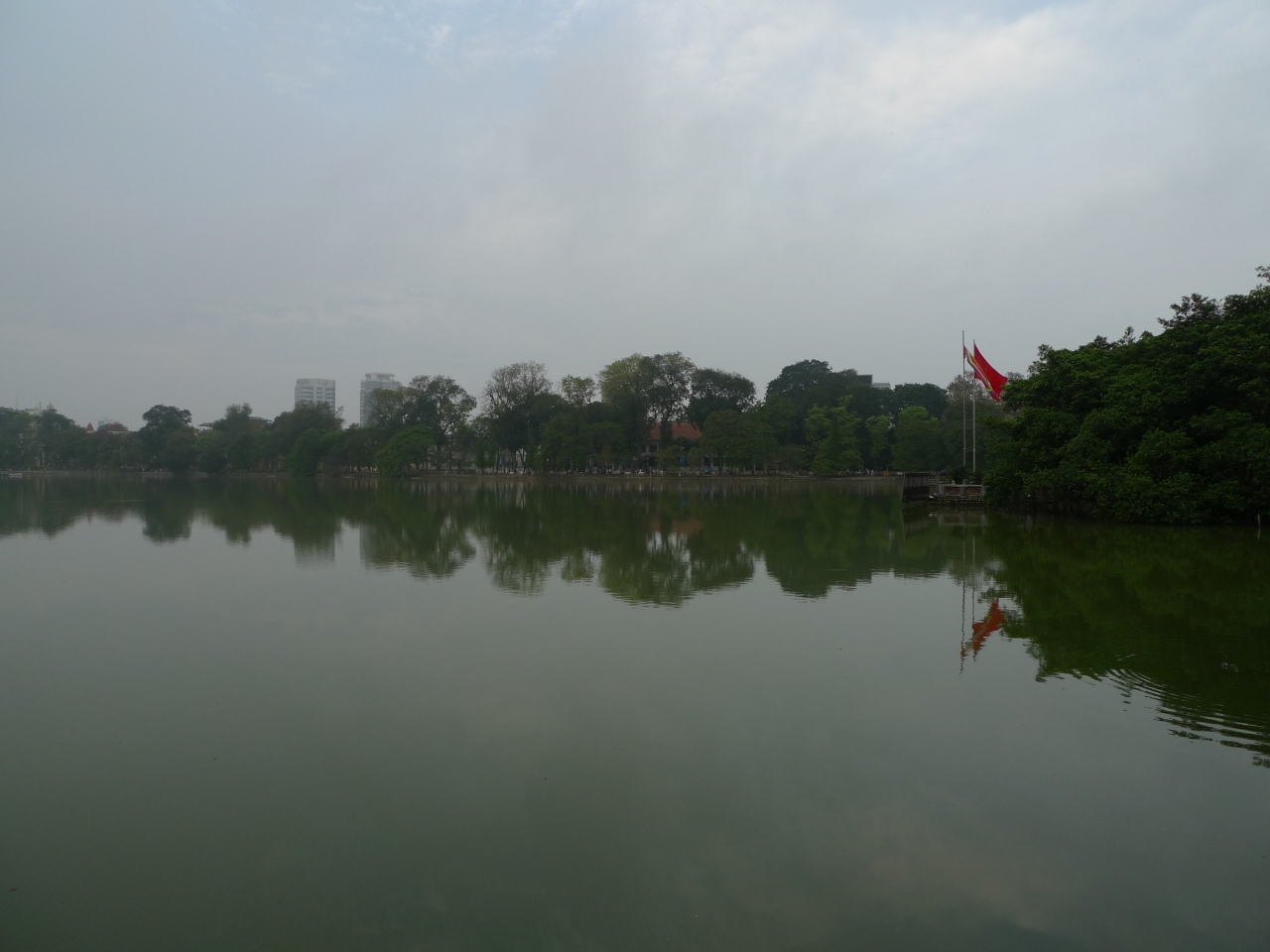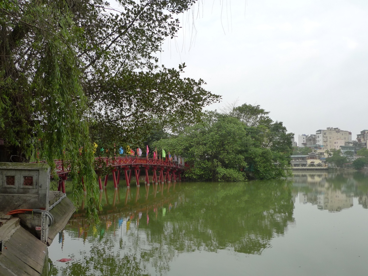 ホアンキエム湖と玉山祠のある小島の間に橋がかかっていて、赤い欄干がアクセントになっている。