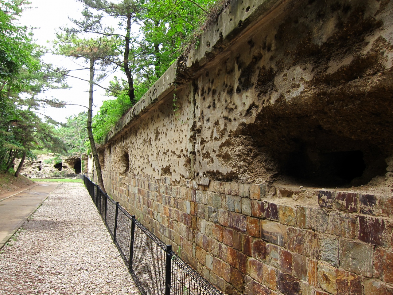 旧日本軍が帝政露西亜軍相手に旅順攻囲作戦を行い最後の最後になってやっと落とせた旅順三大永久要塞のひとつです。09年の旅順開放に先立って開放されていた地であり観光地化されておりますが、コンクリート壁に無数の銃弾跡があり激戦の痕跡を留めております。今は潅木が生い茂っておりますが戦争時は禿山で、何の障害物(遮蔽物)もない斜面を日本歩兵は塹壕を掘りながら駆け上がり、坂の上にある要塞からは機関銃の弾丸が雨アラレと。考えただけでもぞっとします。また、やっとの思いで塀の内側(まさに観光客が通る順路)に侵入したとしても四方から銃弾が飛んでくるという設計になっています。まさに百年前に日本人の血を吸い尽くした要塞です。