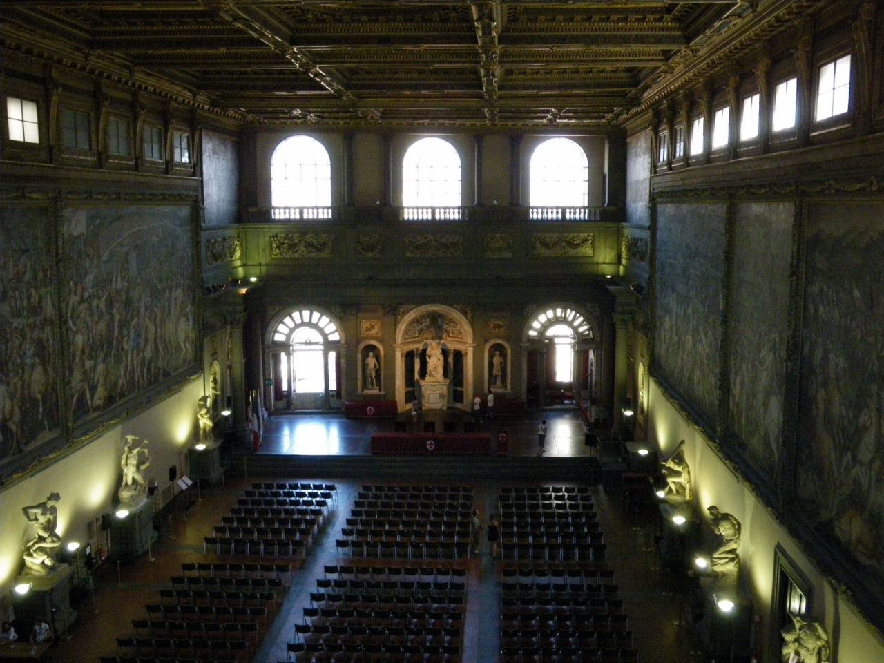 いつ訪れても長蛇の列で毎回パスしてきた「ヴェッキオ宮」でしたが、今回は朝早い時間から並んだので無事入れました! 宮殿の中に入っても、チケット売り場に辿りつくにはX線検査&手荷物検査を受ける必要があり、1名ずつ検査を受けるので、列の進みはかなり遅いです。建物の中は、映画にも登場した「5百人広間」や、装飾の素晴らしい部屋がいくつもあり、じっくり見学するには半日以上かかりそうです...。ここでの結婚式も日本人に人気なんだとか...。なるほど、かなり素敵です!