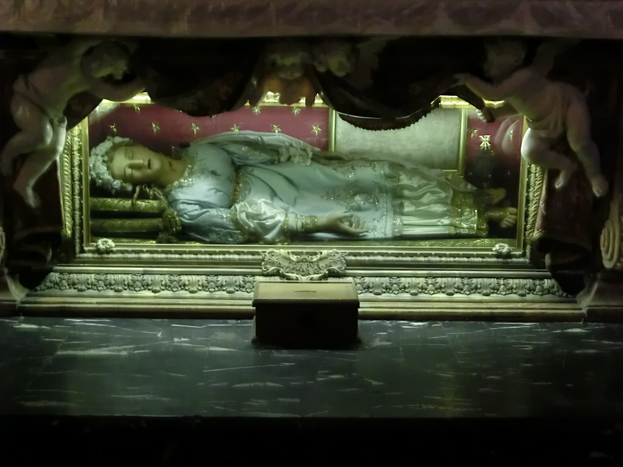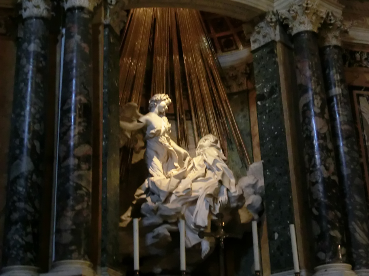 「法悦」というのは「恍惚」のこと。聖女テレーザが、天使が右手に持った火の槍(神の愛)に心臓を貫かれんとするまさにその時、神の御心に触れて甘美な痛みに恍惚の表情を浮かべる様子を表しているのだそうです。 自然光が像の上に差して聖女テレーザと天使を柔らかく照らし出していてすばらしいものでした。