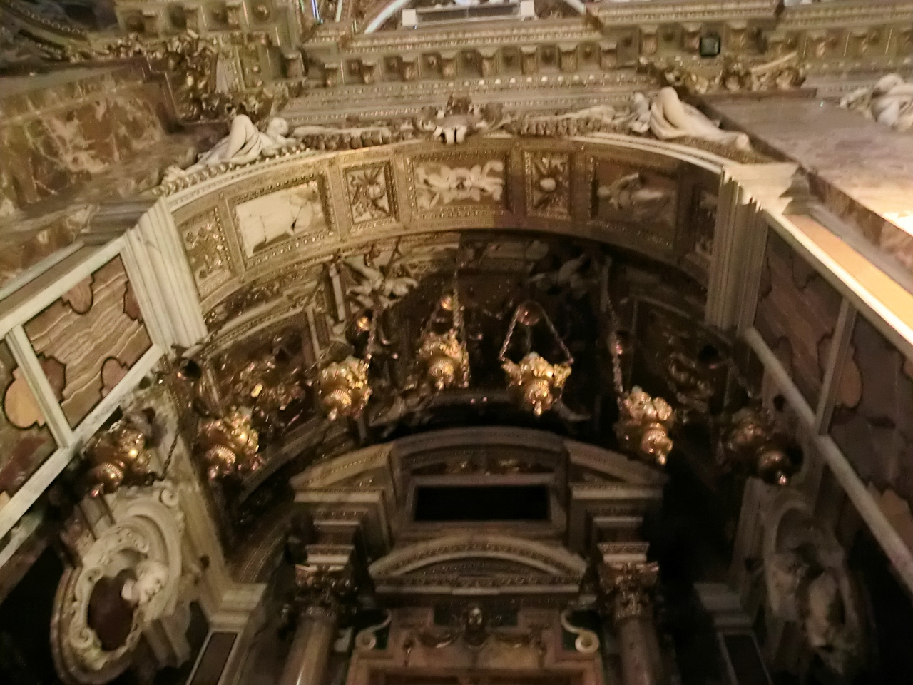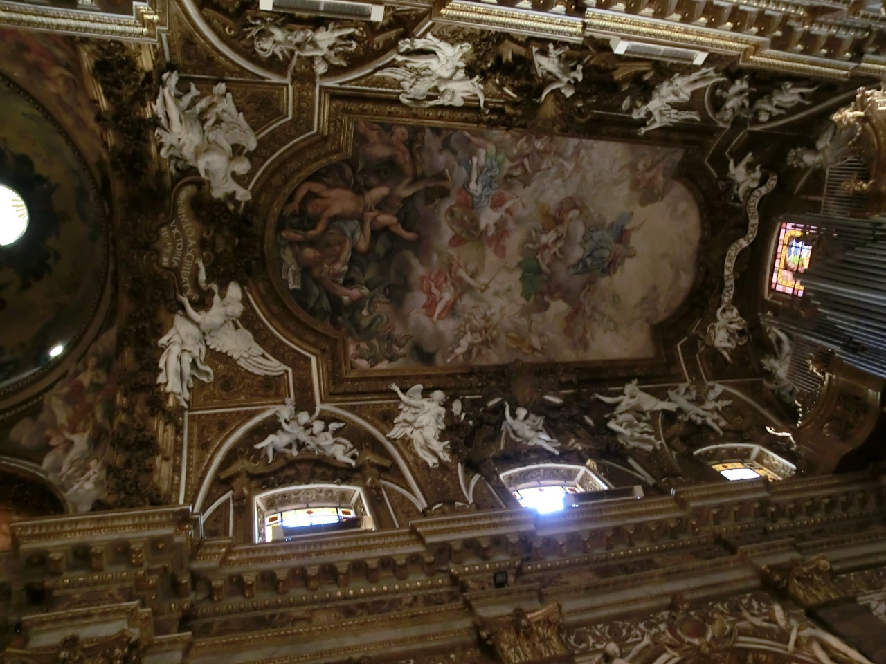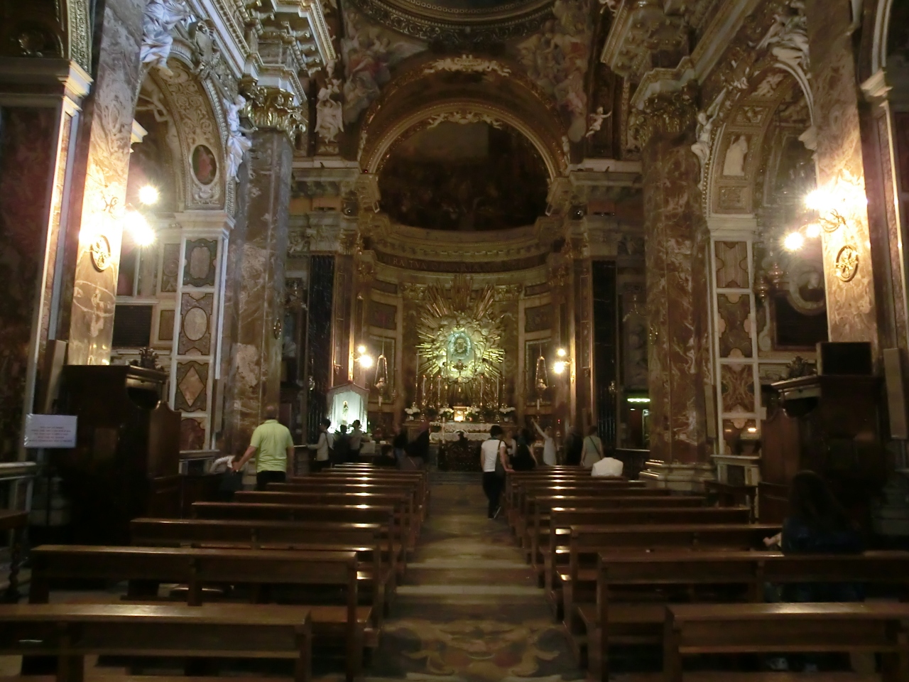私たちは厳かな雰囲気の中、しばし椅子に座って祭壇や豪華な天井画や大理石の柱を眺めました。ローマの教会って外観はシンプルでも、中は想像もつかないように豪華なことがあるのだなと感動。充実したひと時を過ごせました。