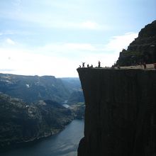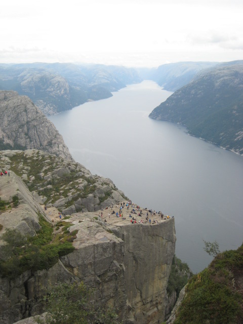 プレーケストーレンまで1時間半かかります。やっとの思いで到着したときにはまだ曇り空でした。切り立った岩のさらに上へ、岩だらけの道なき道を登って行きました。遠くから見るプレーケストーレンは小さく見えるだけでした。再びプレーケストーレン上へ戻ってきた時くらいから晴れてきて、そこから見るフィヨルドは絶景でした。ここまで来る価値はあります。