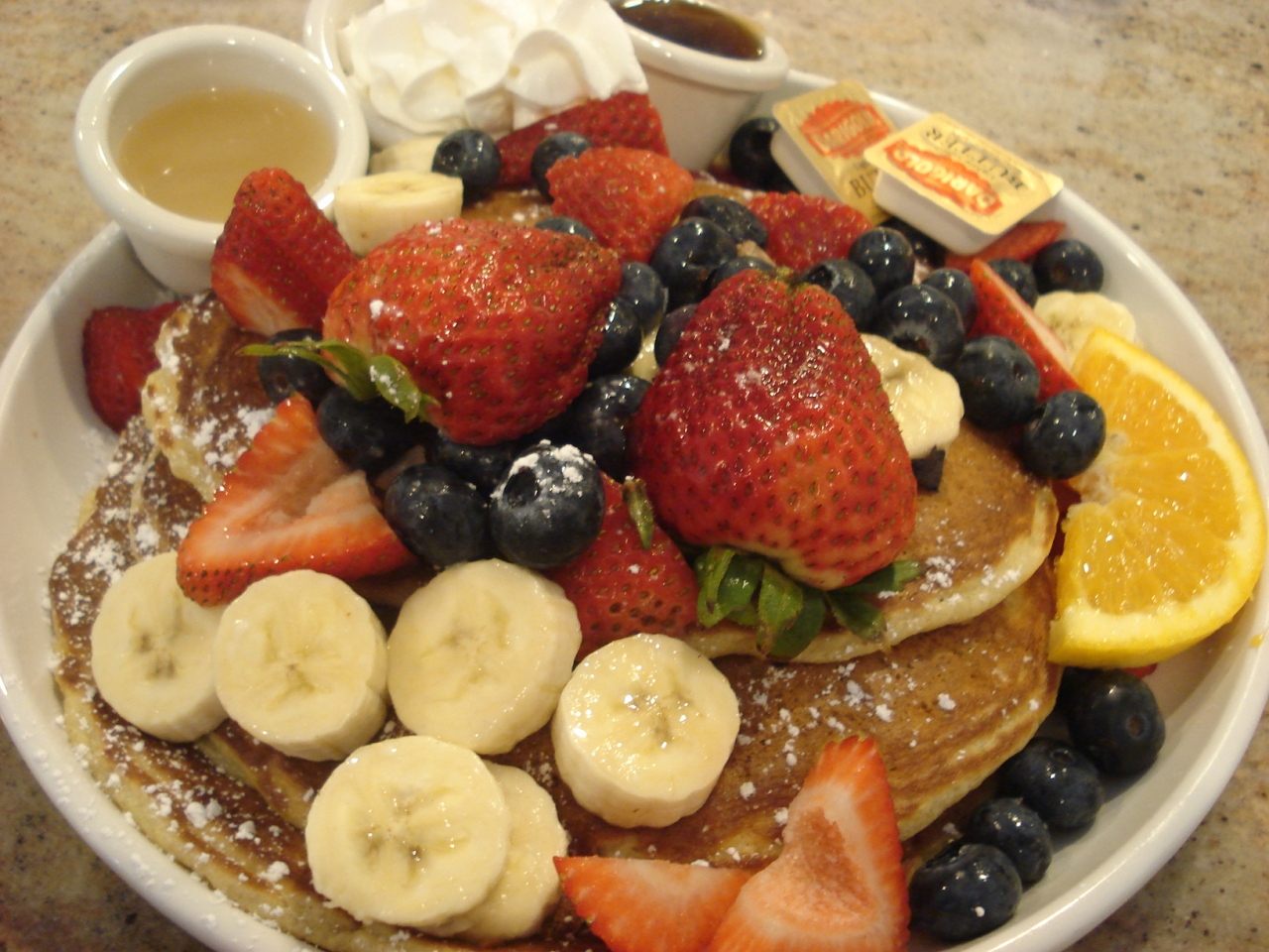 バターミルクパンケーキにイチゴ、ブルーベリー、バナナをトッピング。