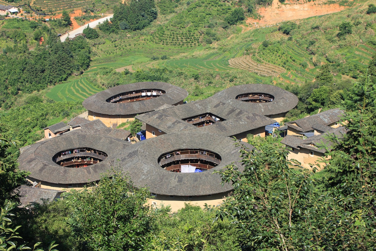 緑に囲まれた丸や四角の土壁の大きな土楼。