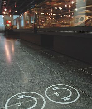 各楽器の前に視聴スポットが丸く床に印され、そこへ立てば目前の楽器の