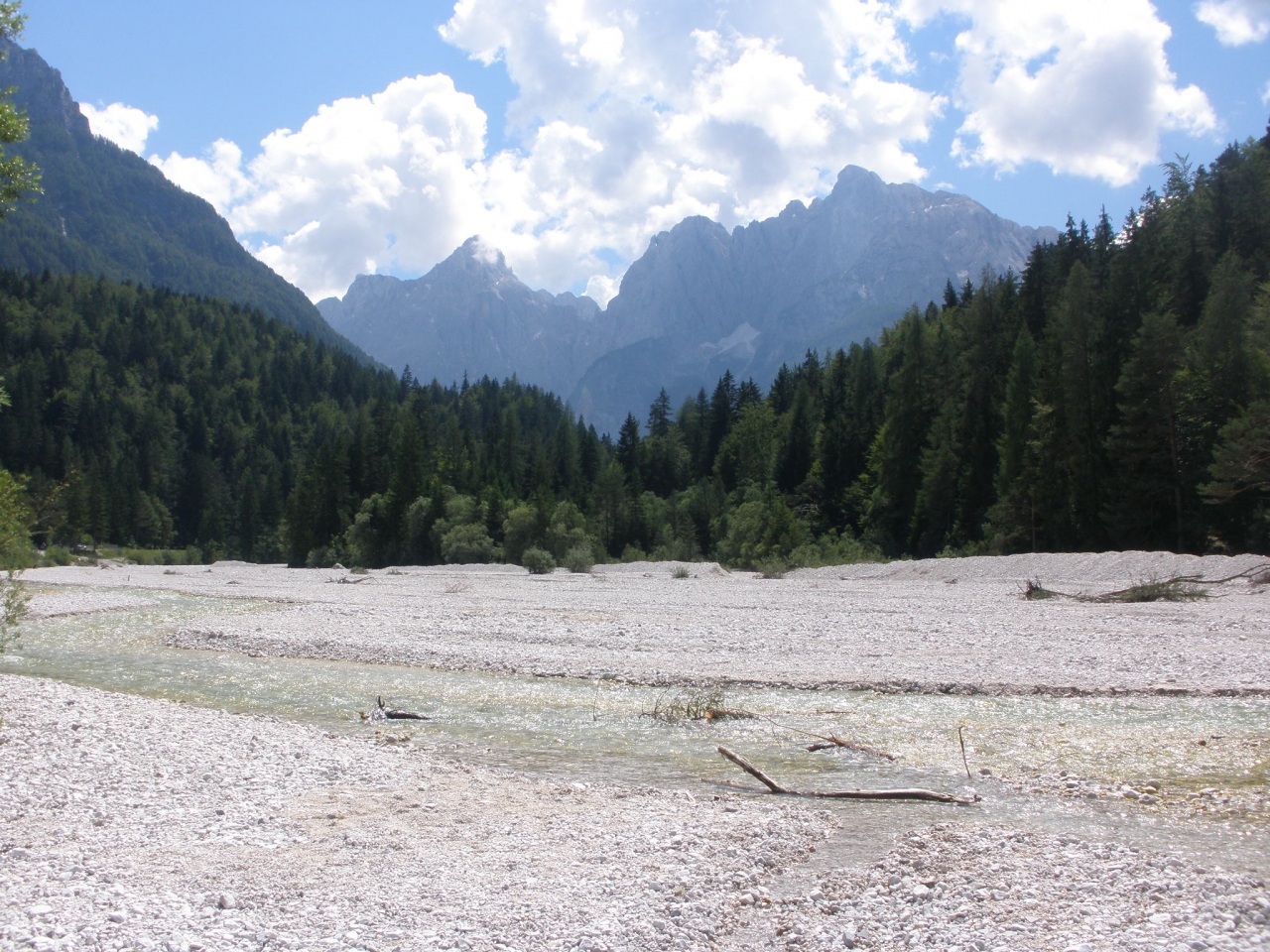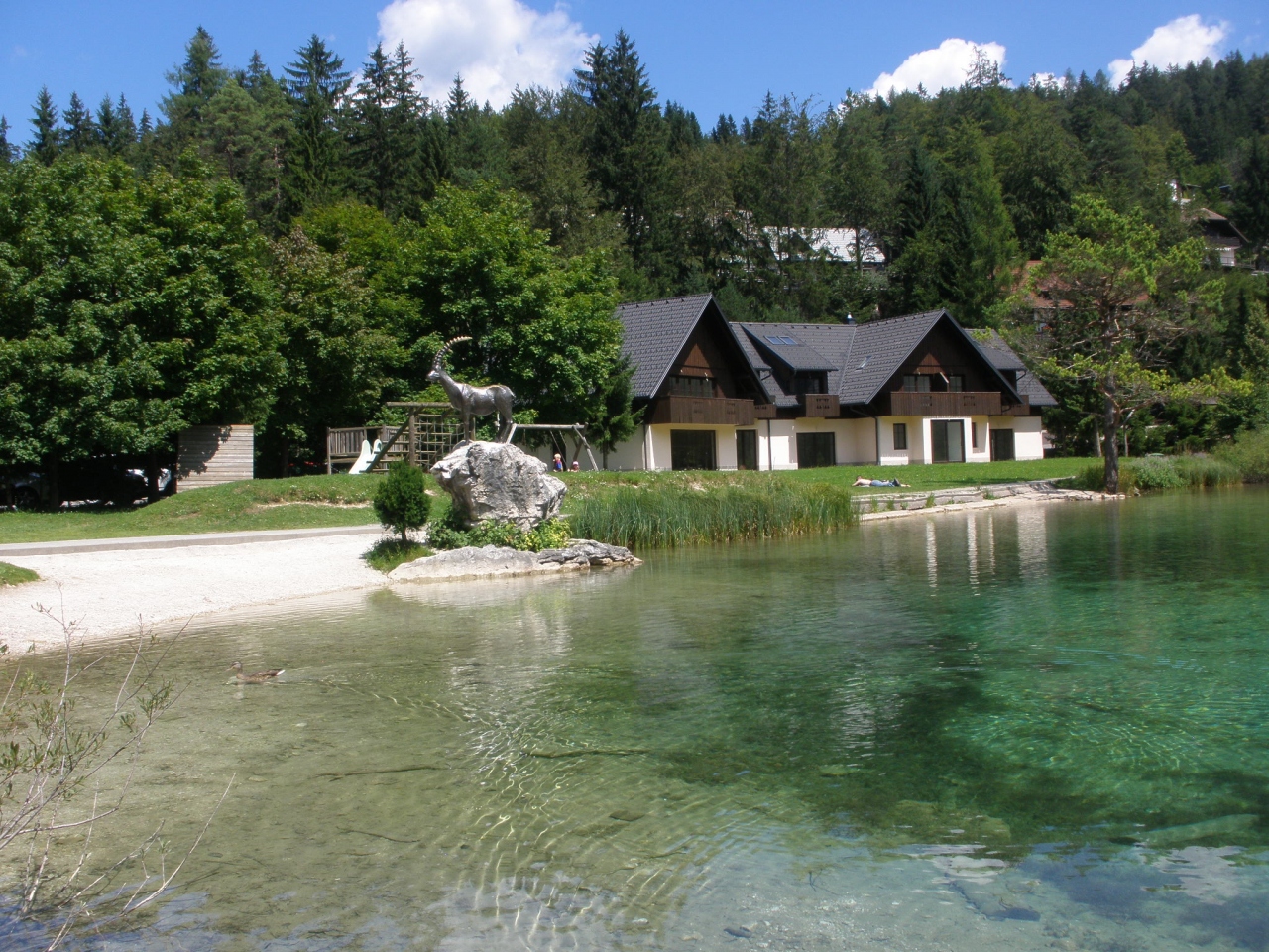 半円形の池が二つ、細い所でつながってできたような小さな湖で、遠くにはトリグラフ山がその岩山の素晴らしい景観を添えてくれています。