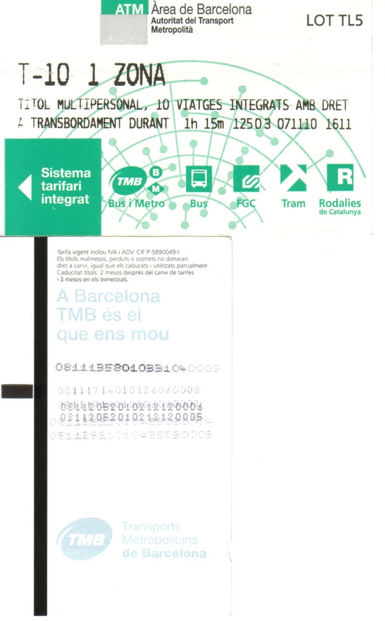 1回券は1.45ユーロ、得なのはTarjeta T-10 という回数券で共に自動販売機または窓口で買う。1枚(10回、8.25ユーロ、2010年11月の値段)自動販売機で買う場合は画面の「 T10 」を指で触り、コイン又は紙幣を入れます。お札で支払う時、おつりは全部コインになります。使用できる紙幣が決まっている自販機もあるので画面にて確認してから紙幣を入れて下さい。回数券は数人で使えます。使用方法は、最初の人が改札口でチケットを入れ、チケットが出た後に改札口を通過してそのチケットを後ろの人に渡すだけです。違反ではないのでご安心を!