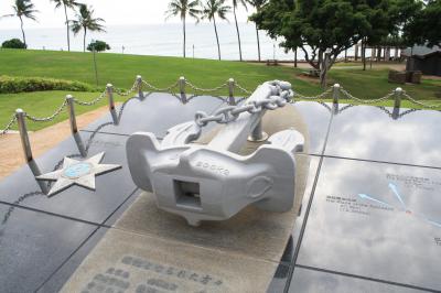 ワードエリアの南側に位置するカカアコウォーターフロントパーク。ここには、えひめ丸の慰霊碑もあります。公園内はきれいに刈られた芝と、ちょっとしたアップダウンがあり、犬の散歩をする地元の人が少しいるだけで、広い空間を一人占めできます。海に面していますが、海側は岩場になっており、釣りはできますが泳ぐことはできません。