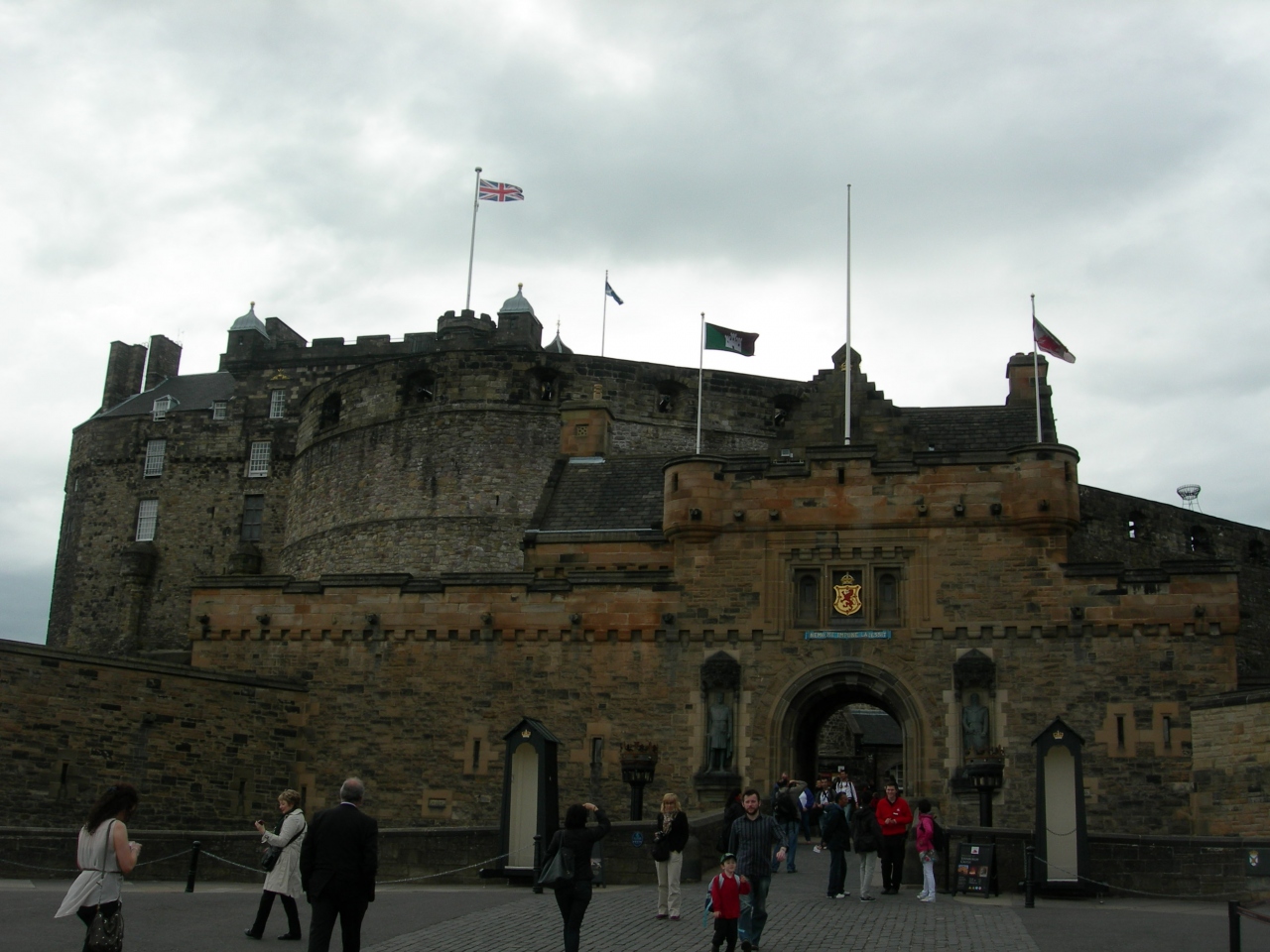 黒っぽい重厚な建物が並ぶロイヤルマイルを登って行くとエジンバラ城に到着です。城の前の広場ではミリタリー・タゥーの準備が進んでいて、客席を作っていました。それが、崖に足場を組んで作っています。ミリタリー・タゥーって城内ではなく、広場でするんですね。意外と狭い感じでした。