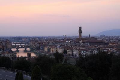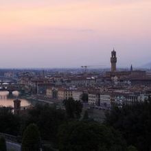 駅前などからバスで行くことができます。オススメは写真にあるように日没に近い時間帯ですが、暗くなってしまうと危険なので明るいうちに帰りのバスに乗りましょう。名前はミケランジェロ広場ですが、多くの方が主役のミケランジェロにお尻を向け、下に広がる美しい景色に夢中です。