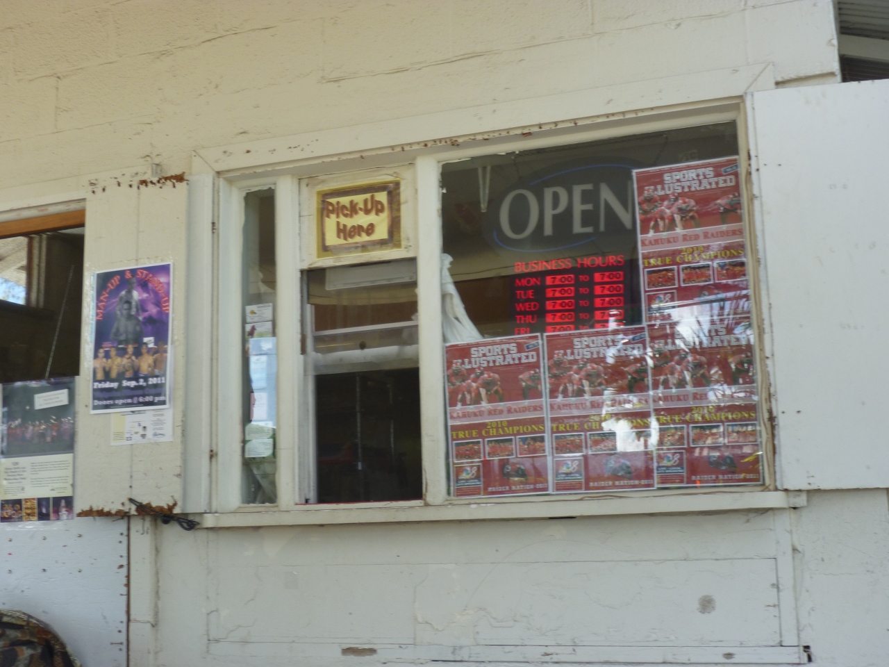 クアロア牧場で馬に乗ったあと、どっかでランチを……と思いながら車を走らせていたら、あれ、もうカフク。そしてこの看板です。すっかり誘導されて、そのへんのスーパーの駐車場に車を停めて、チャレンジすることにしました。