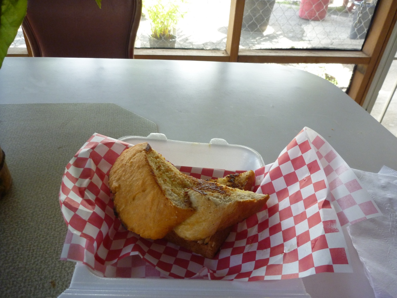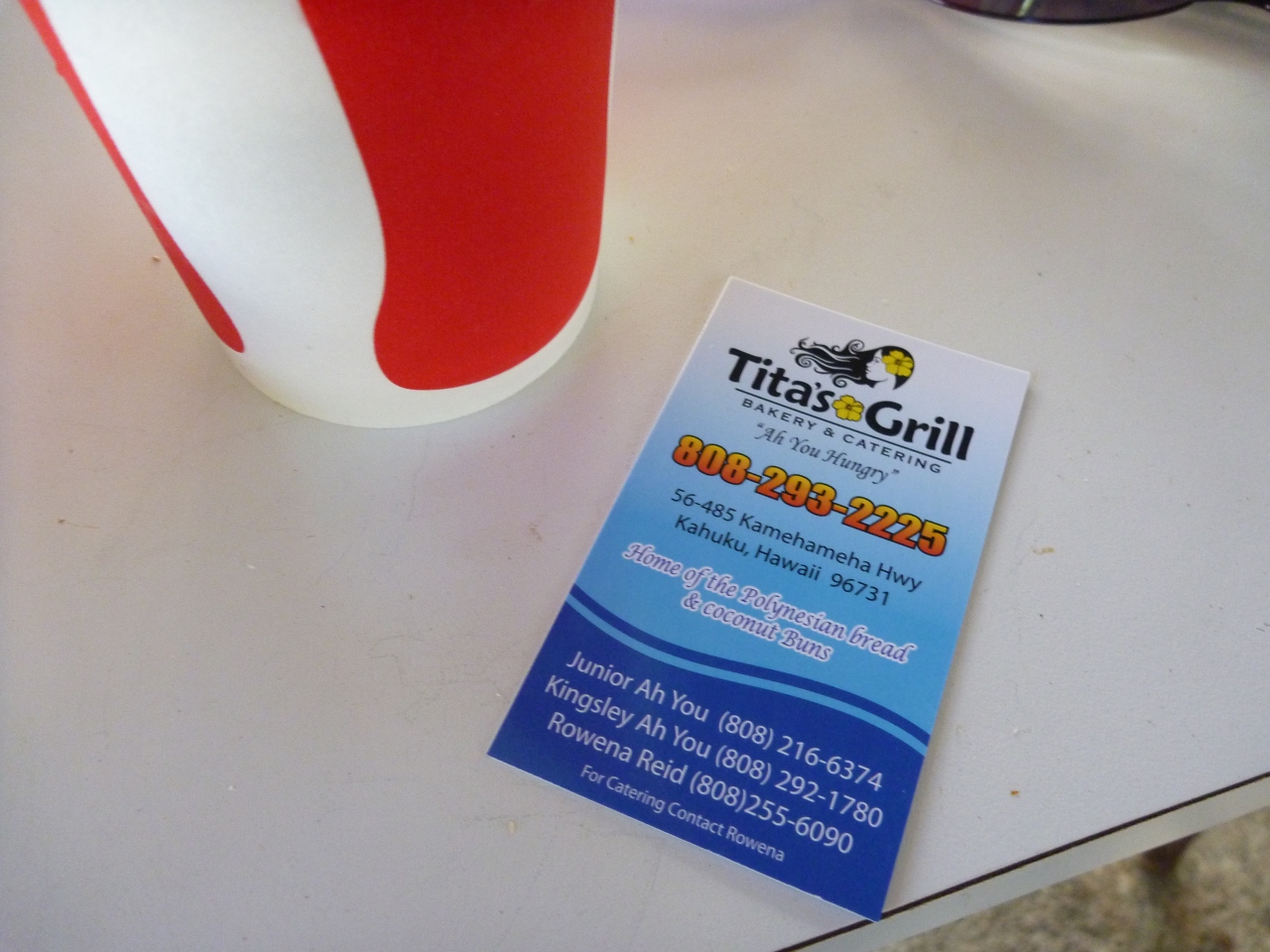 シュリンプだけでもとても食べきれないのに、サービスで出てきたポリネシアン・ブレッドがまたおいしいのです。困った……トーストしてバターをぬっただけなのに、もちもちしていておいしい! これは車に持ち帰りました。ご主人、わたしにYelpでレビュー書いてくれ、って名刺までもってきました。サービスの理由はそこだったのかもしれませんが、とにかくおいしいガーリックシュリンプ体験ができてハッピーでしたよ!