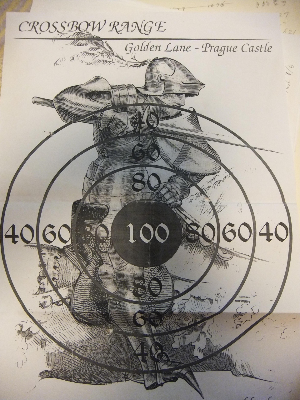 プラハ城の黄金小路の2階は鎧がずらっと並んでいますが、その先にクロスボウができるところがありました。3射50CZK。クロスボウは結構重いですが、トリガーを引くだけで力はいりません。撃った後の的をもらいましたが、いい線いってたかも。