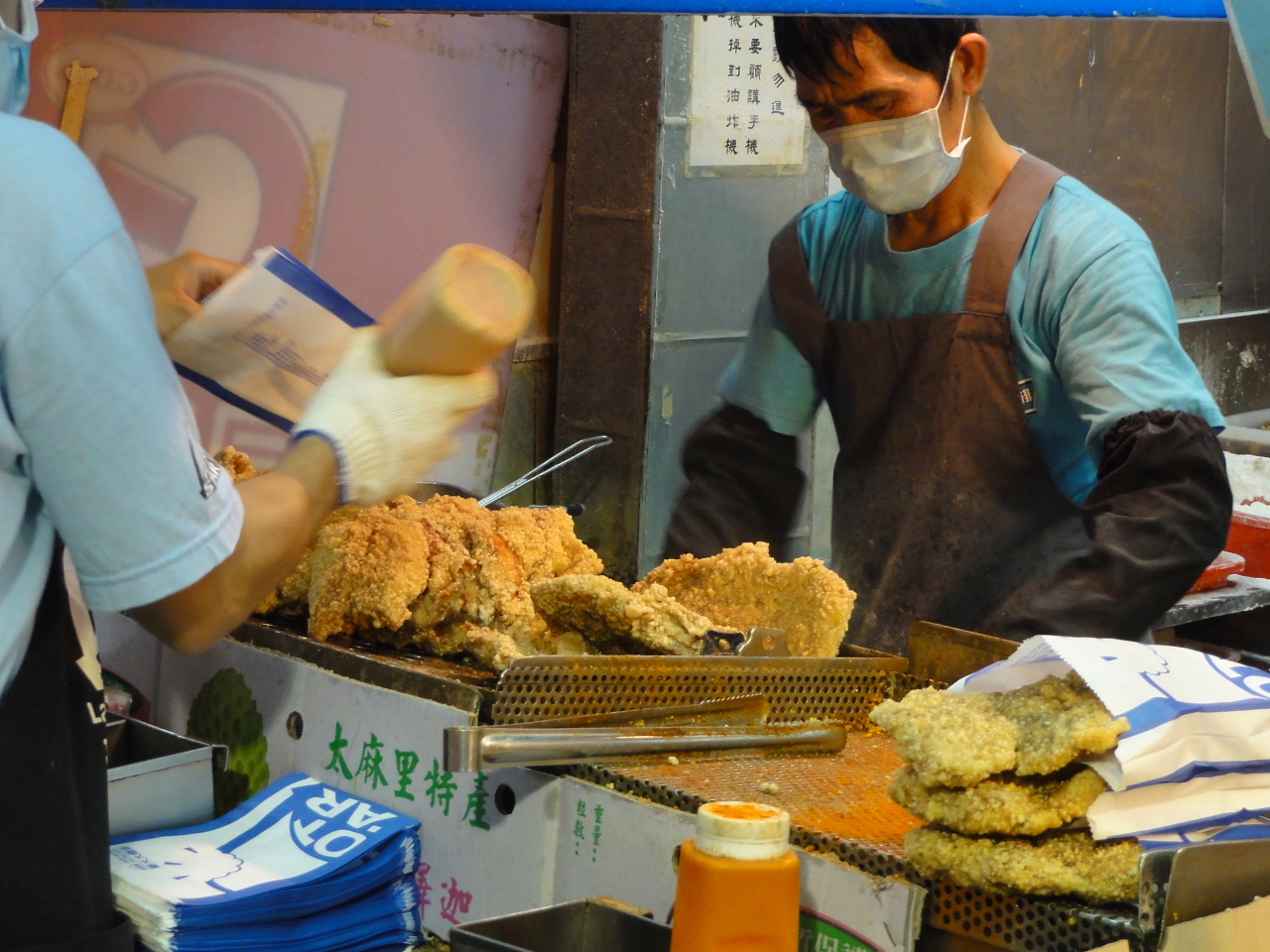まずは、駅を降りて左手にある美食広場に向かう。ここは屋根で覆われた建物の中に食べ物屋が沢山あり、巨大なフライドチキン、マンゴジュースを買って探索。