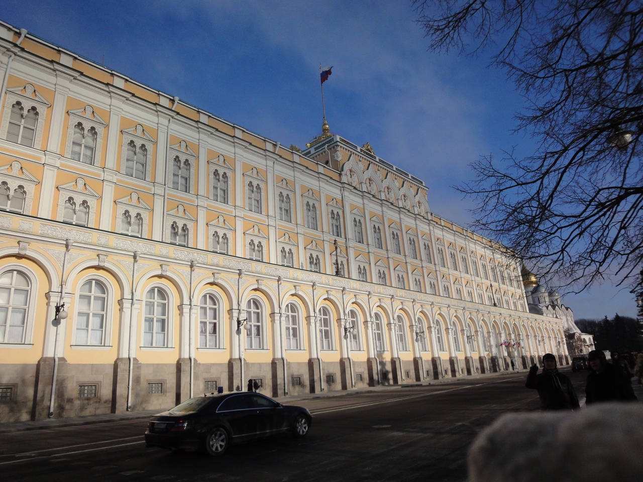 武器庫を出て、ブラゴヴェシェンスキー大聖堂まで、モスクワ川と平行に大クレムリン宮殿の横を歩きました。全長は125mで、部屋数700のニコライ1世が建てた宮殿とのことです。