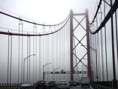 スペインからリスボンへレンタカーで向かうと、A6からA2へ番号が変わり、しばらくするとリスボンへと続くつり橋(Ponte 25 de Abril)の料金所が現れます。雨のため、せっかくのリスボン遠景は望めませんでした。主人いわく、サンフランシスコのゴールデンゲートブリッジを一回り小さくしたみたいな橋との感想...。赤い色といいカタチといい、そういえば似ている気がします。帰りは、橋の上から「リオ・デ・ジャネイロ」にあるのと同じ高さ110mの巨大なキリスト像が見られます。