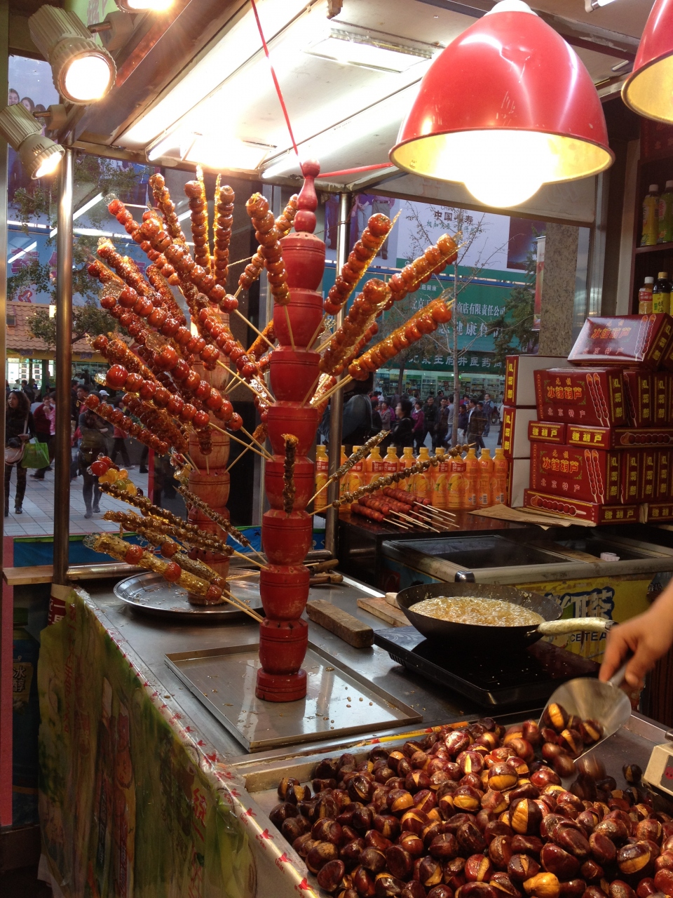 北京到着初日に、北京らしいところを、と思って散策。銀座の歩行者天国っぽい様子を見せていたと思えば横道に入るとディープな中華街。中国にいて中華街という表現もおかしいけれど。串焼きの飴がけ果物とか肉とかサソリとかムカデとか!!なんでも食べるのね。