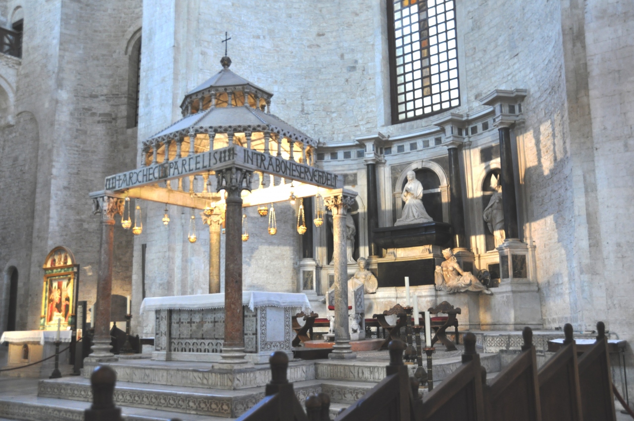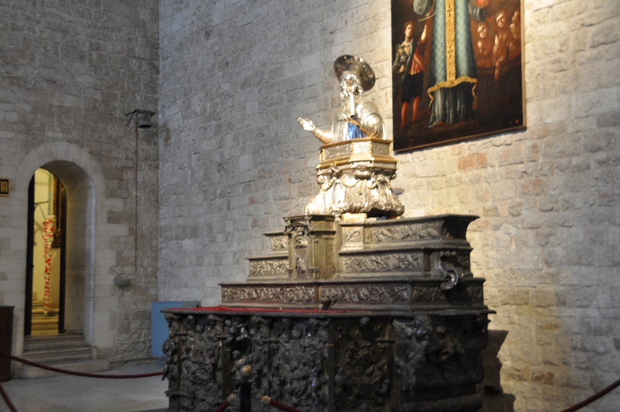 正面の扉のカバが印象的ですが、教会内は落ち着きがあって、荘厳な印象です。喧騒とした旧市街地にありますが、静かな空間になっています。町の人たちの心のよりどころといった教会でしょうか。サンタクロースのルーツと言われている聖ニコラの遺骨が安置されています。