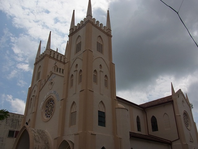 オランダ広場から赤い建物が並ぶラクサマナ通りを歩いて数分で着きます。お庭にはザビエルとやじろう(日本人のキリスト教徒で、ザビエルに日本行きを決意させた人だとか。)の像があります。内部は撮影禁止でしたが、かわいいステンドグラスが印象的でした。