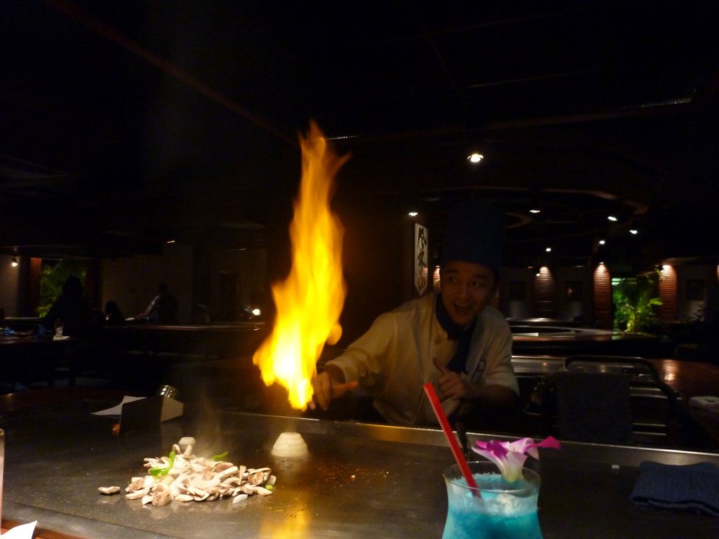 こちらはハワイの名物店、粋なパフォーマンスで評判です。アメリカンなハイテンションショーを期待できるのかと思いきや、テンション低めな料理人がシュールなジョークを交えながら鉄板料理を振る舞ってくれます。