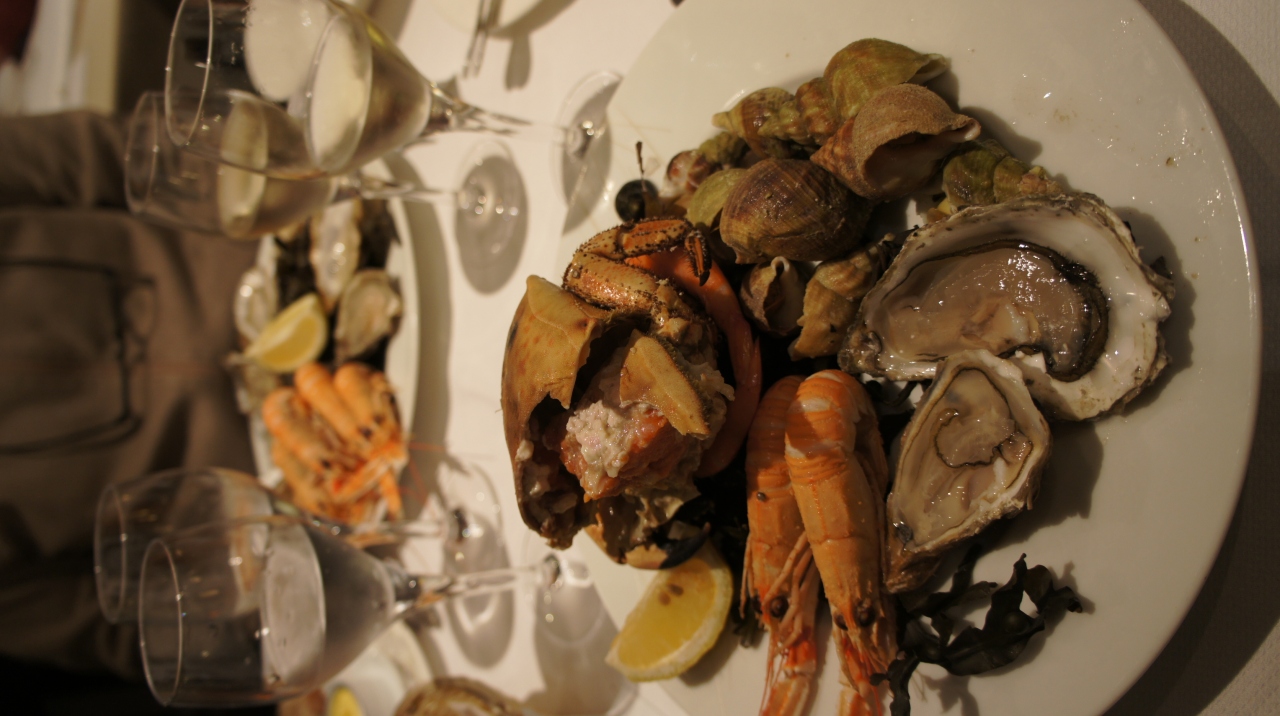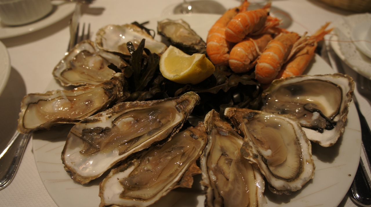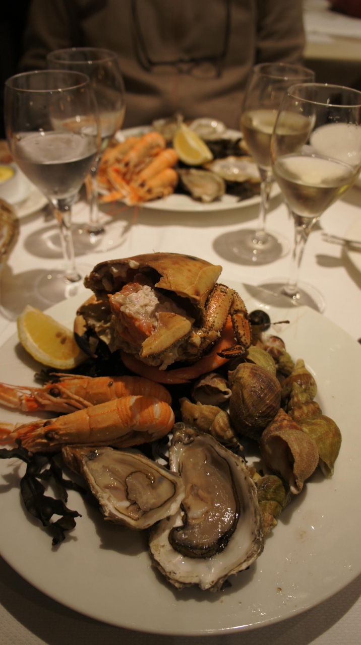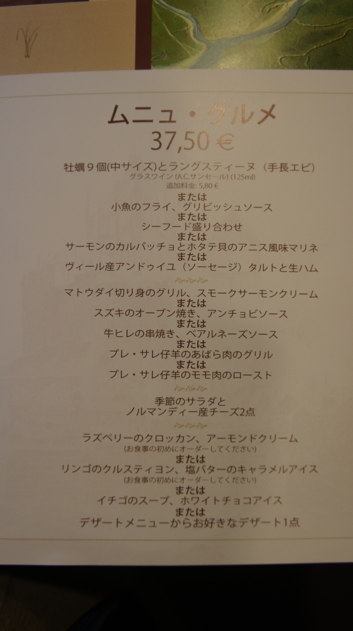 メルキュールホテルで部屋の清掃を待っている間にフロントに置いてあったメニューを見ていて夕食はここに決めました。フロントで予約が必要か尋ねると「そのほうが良いですよ。」と言われ8時に予約しておきました。時間の少し前に行くと窓際の良い席に案内されました。テーブルには名前が書かれたカードが添えられています。スパークリングの水とソーヴィニヨンを1本、料理はコースを注文しました。牡蠣と手長エビの盛り合わせ、シーフードの盛り合わせ、メインはプレ・サレ羊のアバラ肉グリル、モモ肉のロースト、チーズ盛り合わせ、デザートはラズベリーのクロッカン、塩バターキャラメルアイスをいただきました。量的にも非常に満足出来るし、もちろんシーフードも羊も美味しかったです。コーヒーも一緒に出してもらって大満足の食事で二人で103ユーロでした。