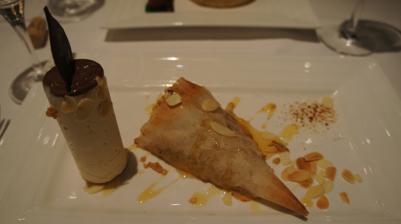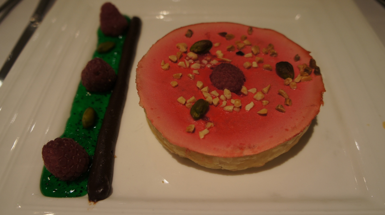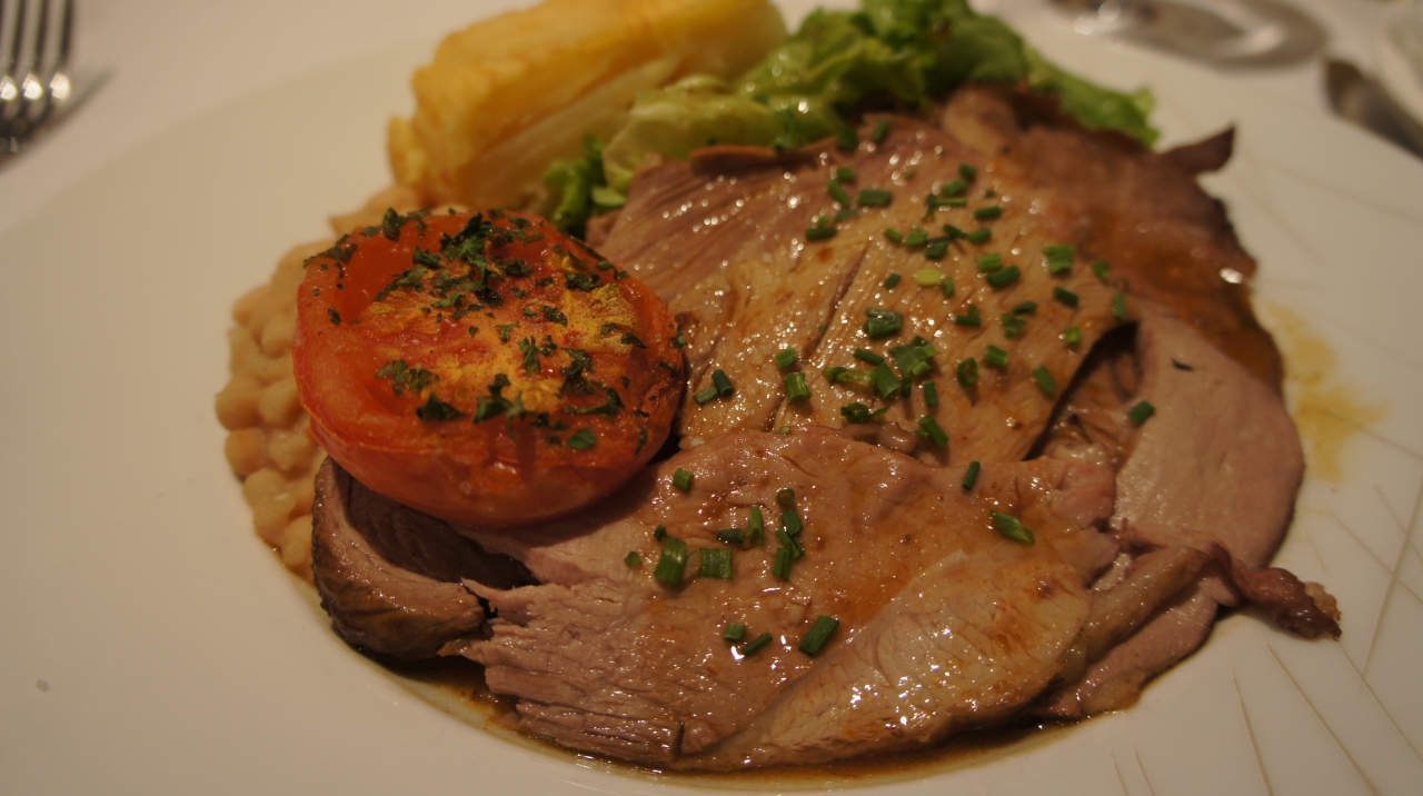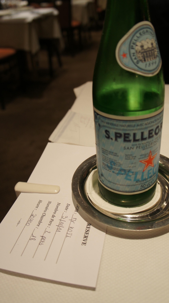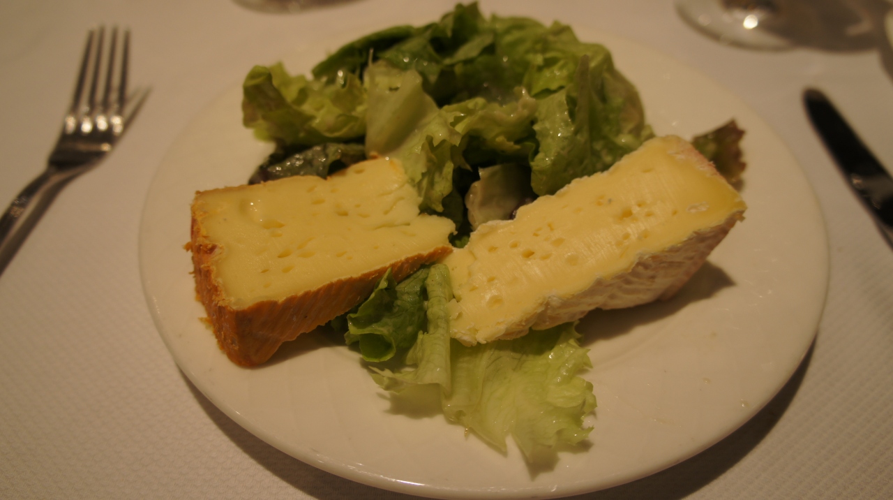 メルキュールホテルで部屋の清掃を待っている間にフロントに置いてあったメニューを見ていて夕食はここに決めました。フロントで予約が必要か尋ねると「そのほうが良いですよ。」と言われ8時に予約しておきました。時間の少し前に行くと窓際の良い席に案内されました。テーブルには名前が書かれたカードが添えられています。スパークリングの水とソーヴィニヨンを1本、料理はコースを注文しました。牡蠣と手長エビの盛り合わせ、シーフードの盛り合わせ、メインはプレ・サレ羊のアバラ肉グリル、モモ肉のロースト、チーズ盛り合わせ、デザートはラズベリーのクロッカン、塩バターキャラメルアイスをいただきました。量的にも非常に満足出来るし、もちろんシーフードも羊も美味しかったです。コーヒーも一緒に出してもらって大満足の食事で二人で103ユーロでした。